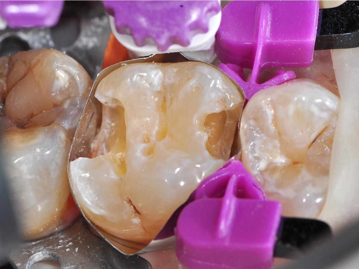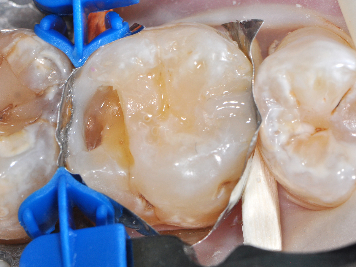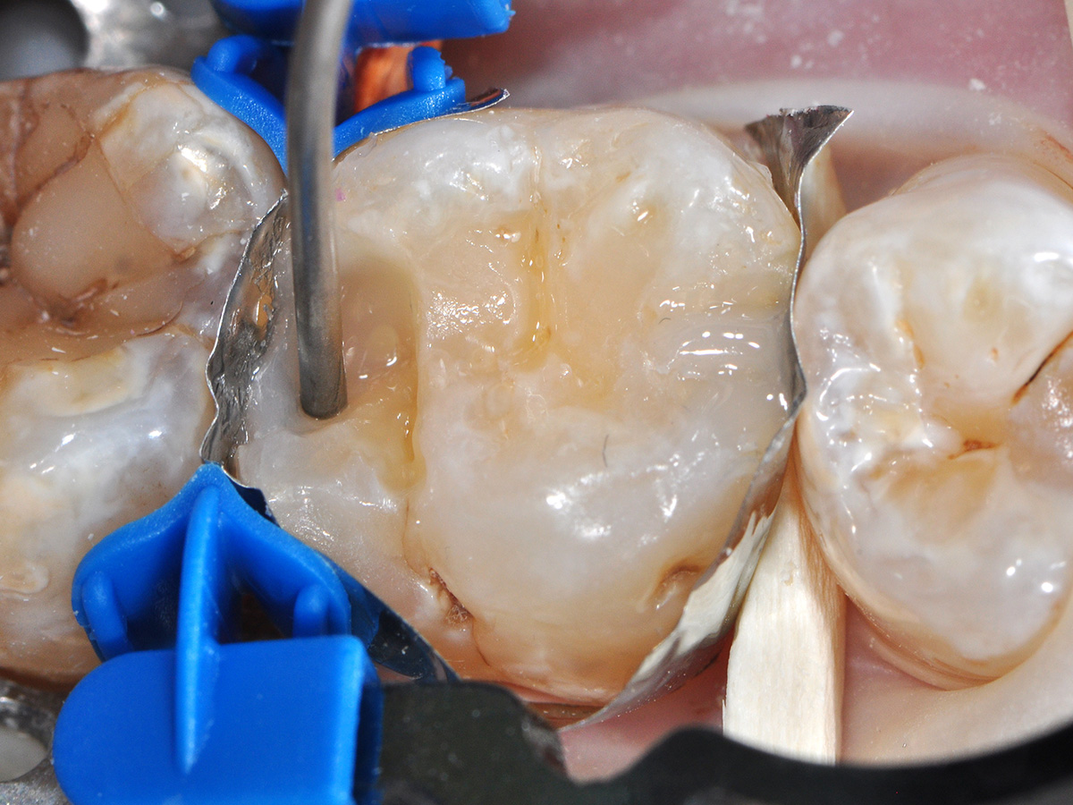 Bei der halbjährlichen Routineuntersuchung dieser Patientin fielen die Approximalkaries an Zahn 16, sowie eine insuffiziente, ausgewaschene okklusale Füllung auf. Nach Anästhesie wurden die kariösen Defekte eröffnet und unter Kofferdam exkaviert.