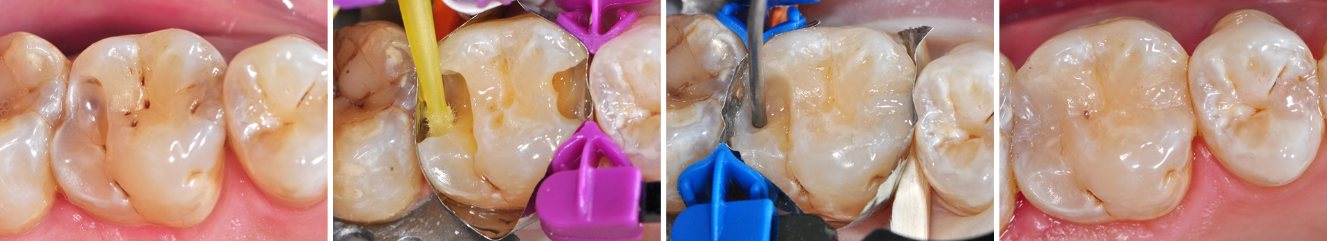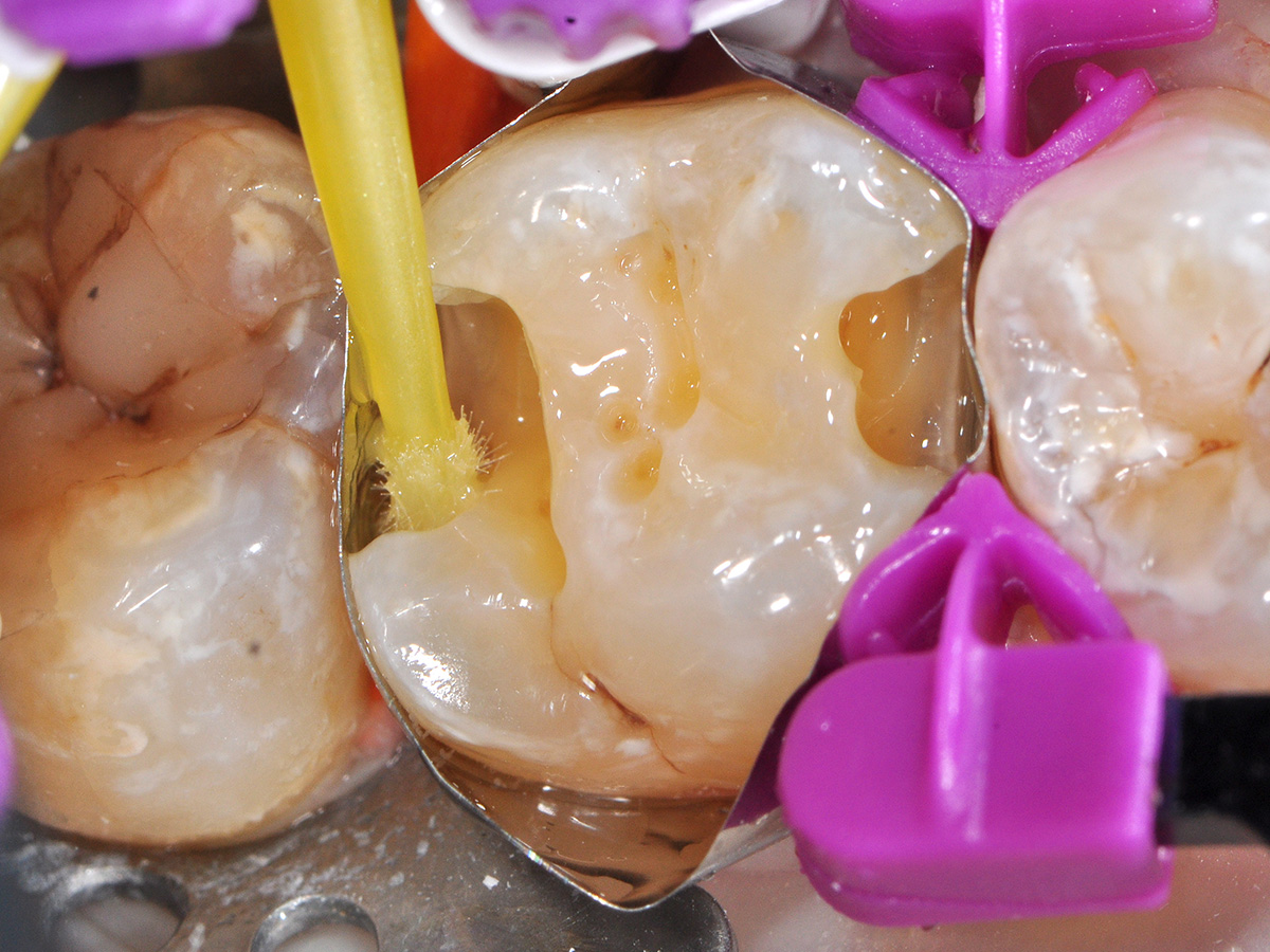 Die Schmelzränder wurden selektiv mit Phosphorsäure (BISCO Etch 37%) konditioniert, um eine langfristige Randdichtigkeit der Füllungen zu gewährleisen – trotz der erheblichen Belastung durch Bruxismus.