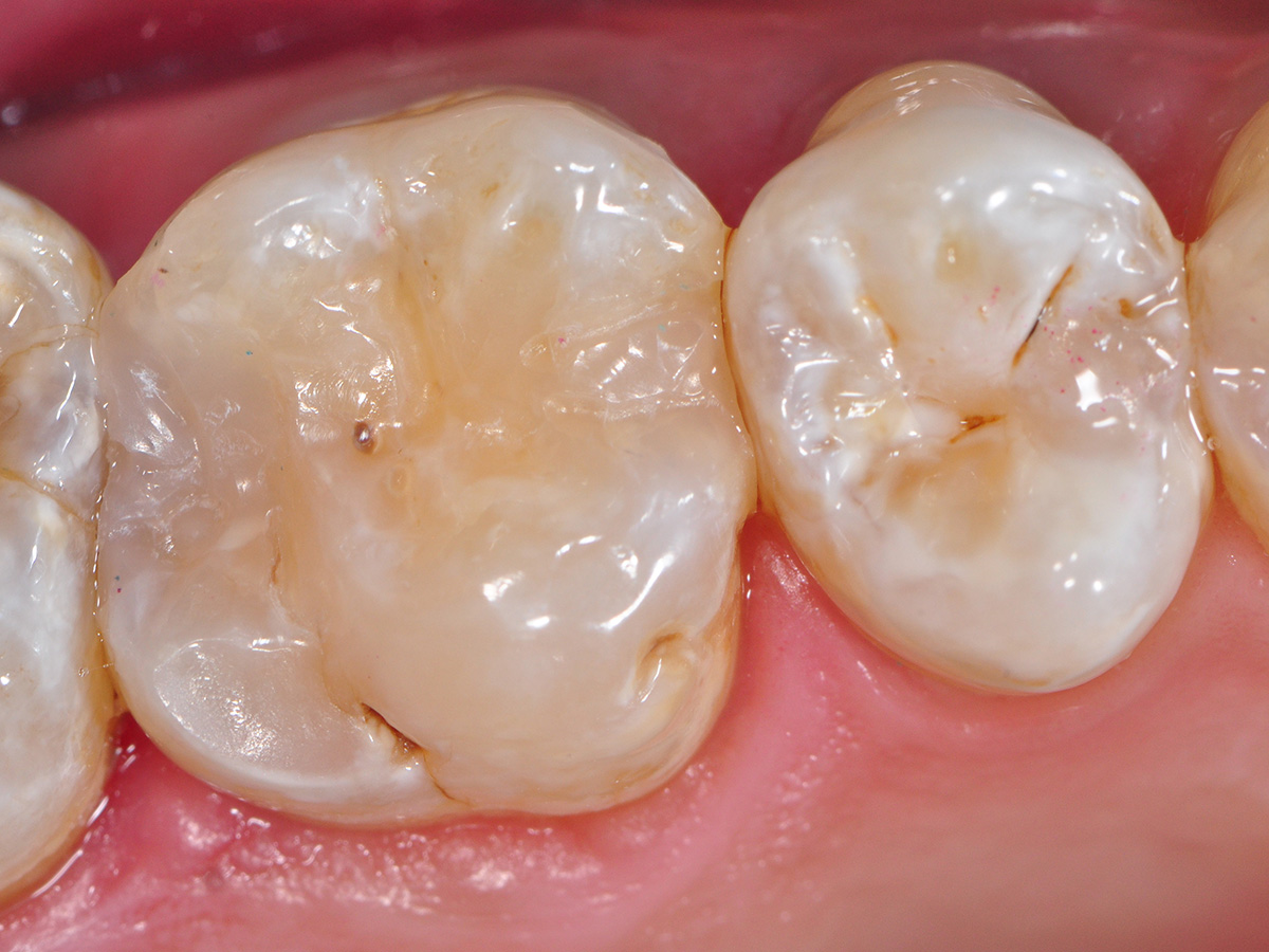 Nachdem mit inspiro Schmelzmasse noch die Kauflächenstrukturen modelliert und ausgearbeitet wurden, sind die beiden Füllungen praktisch nicht mehr zu erkennen.