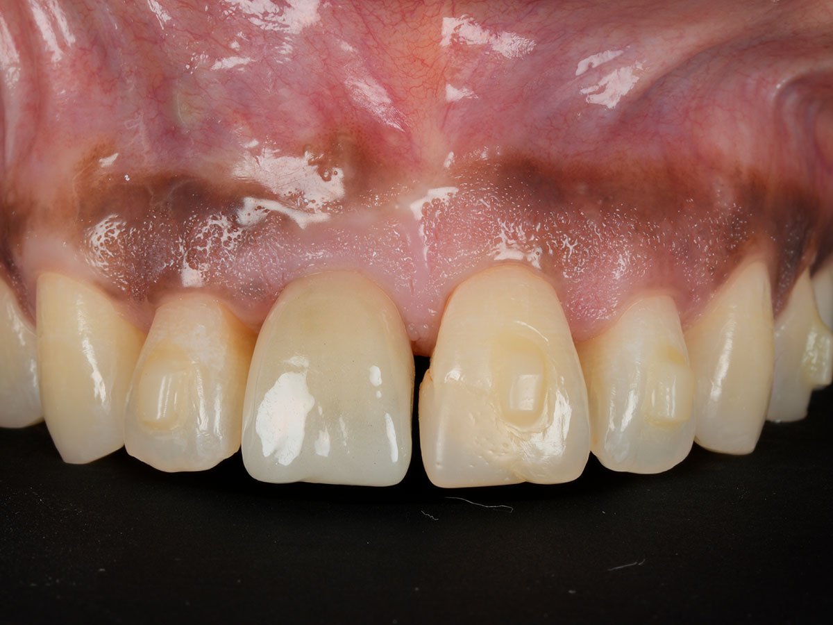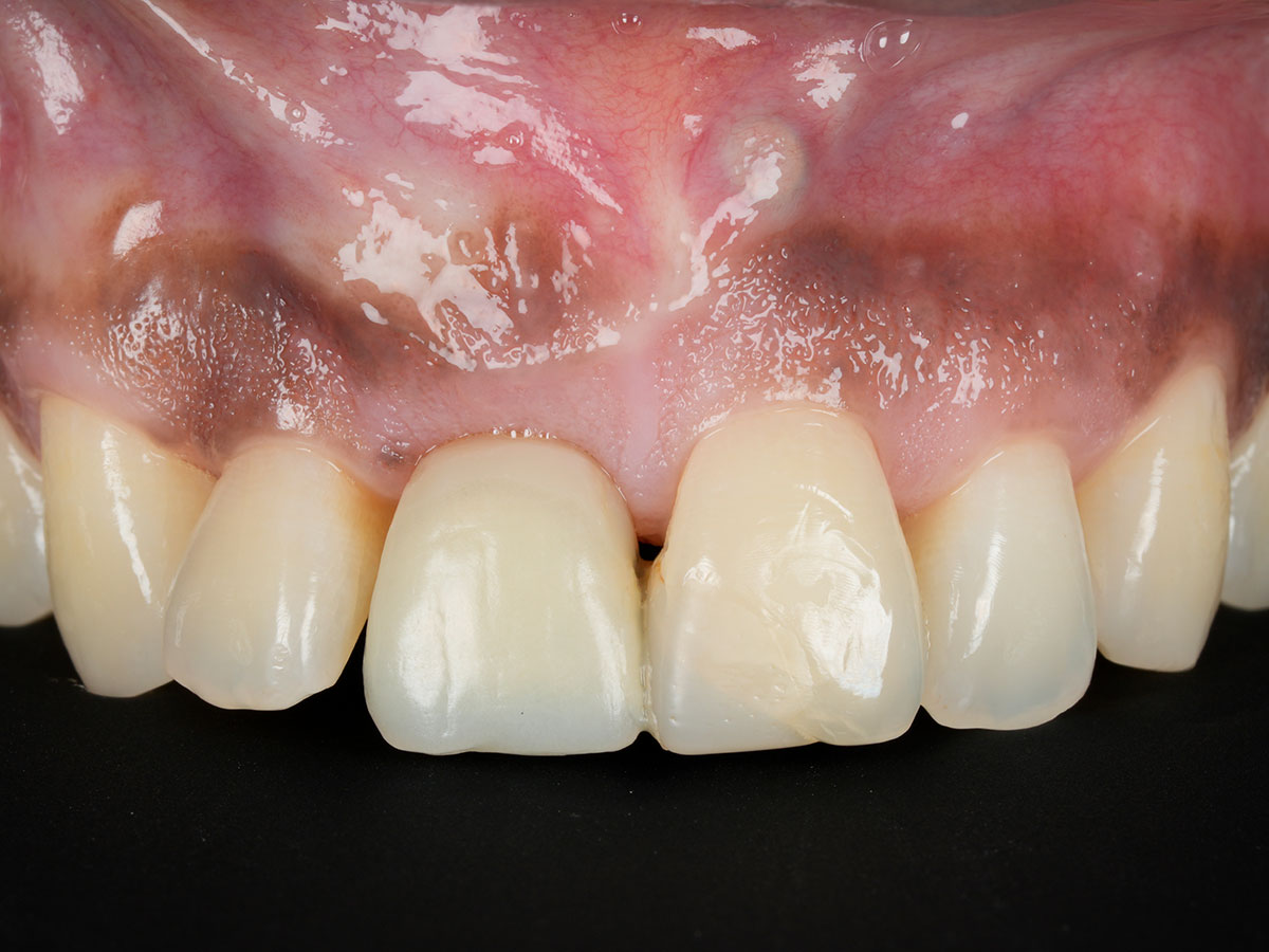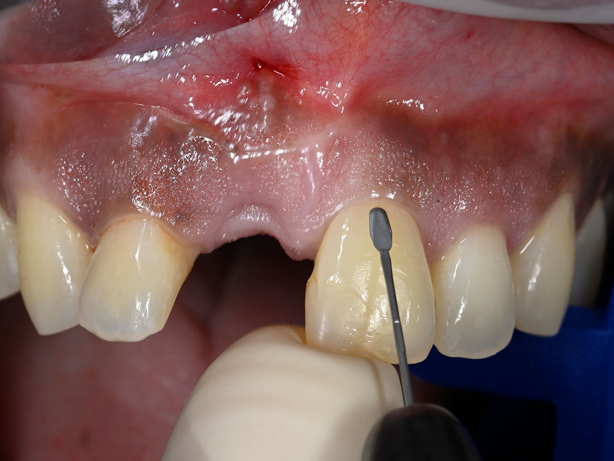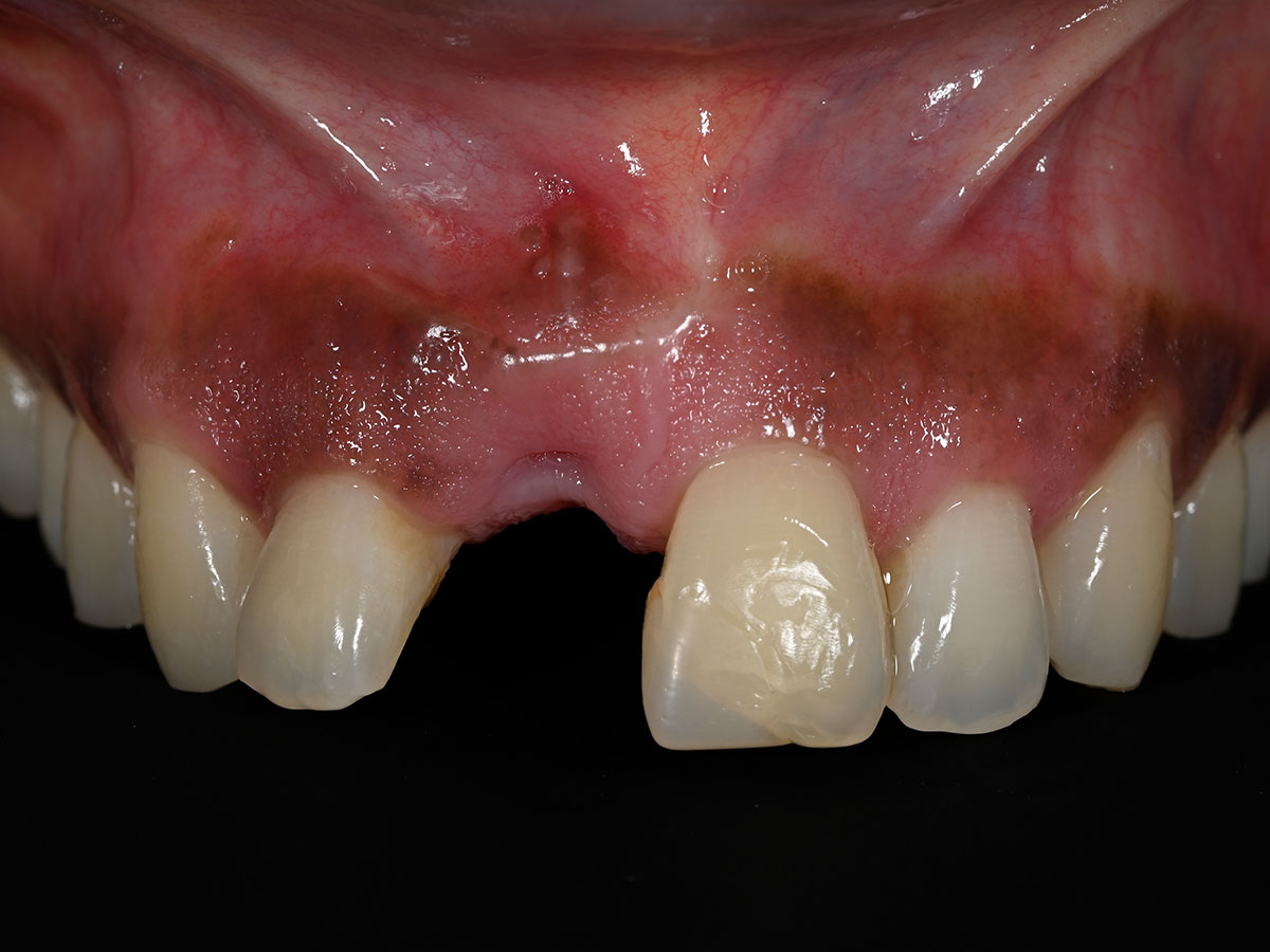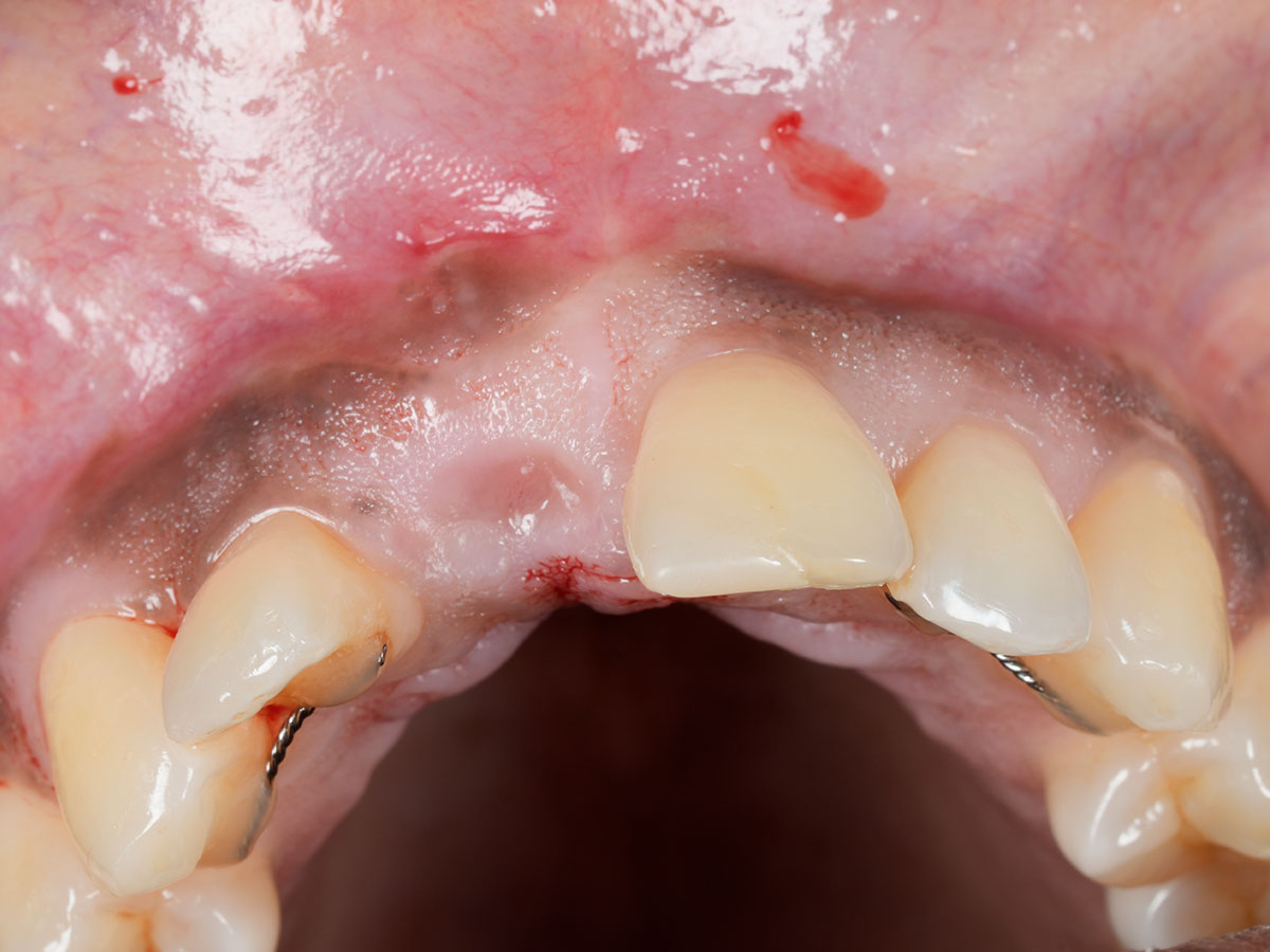 Klinische Ausgangssituation mit verzögerter Knochenregeneration 4 Monate nach Extraktion Zahn 11 (alio loco; gewanderter 12 durch gelockerten Retainer)