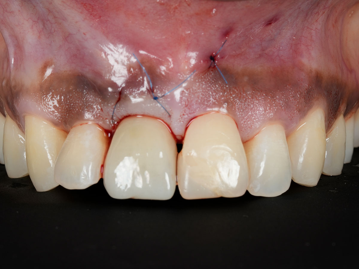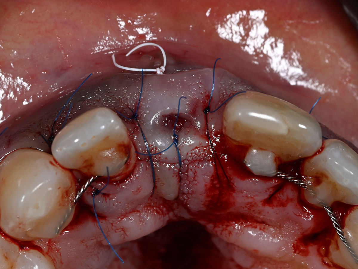 Mehrschichtiger Wundverschluss von inzisal (krestal sichtbarer Bereich der Weichgewebsinvagination in die alte Alveole, jetzt ohne Verbindung zur GBR).
