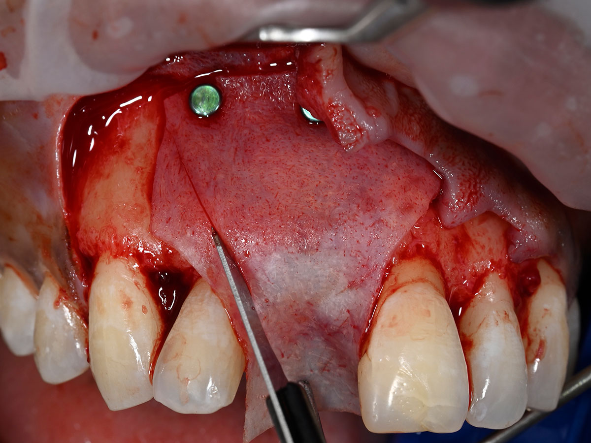 Anpassung der rehydrierten und mit Pins fixierten Osteobiol Lamina Membran im Defekt.