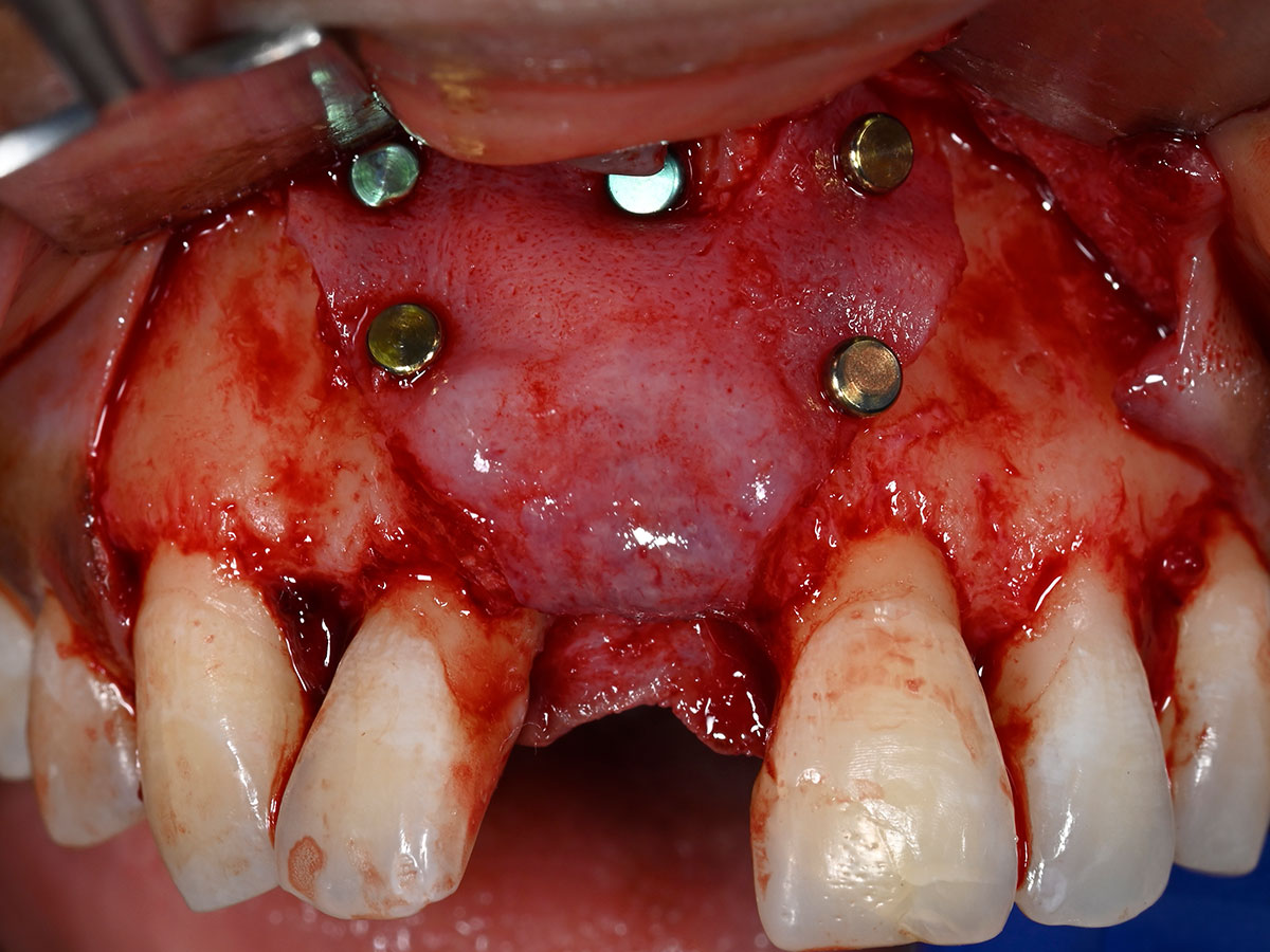 Zustand nach Rolllappentechnik zur Freilegung des Implantats und eingesetztem, verschraubtem PMMA-Provisorium.