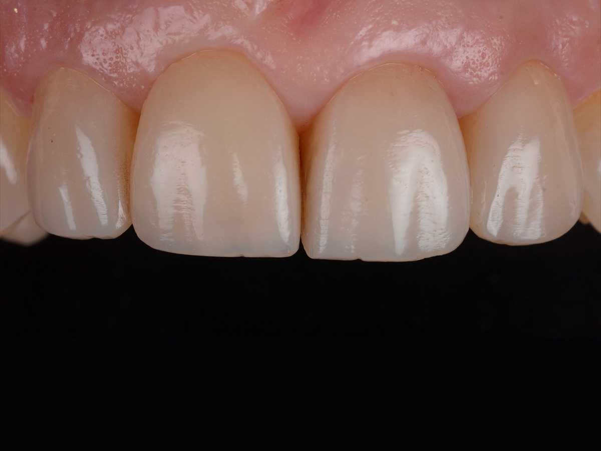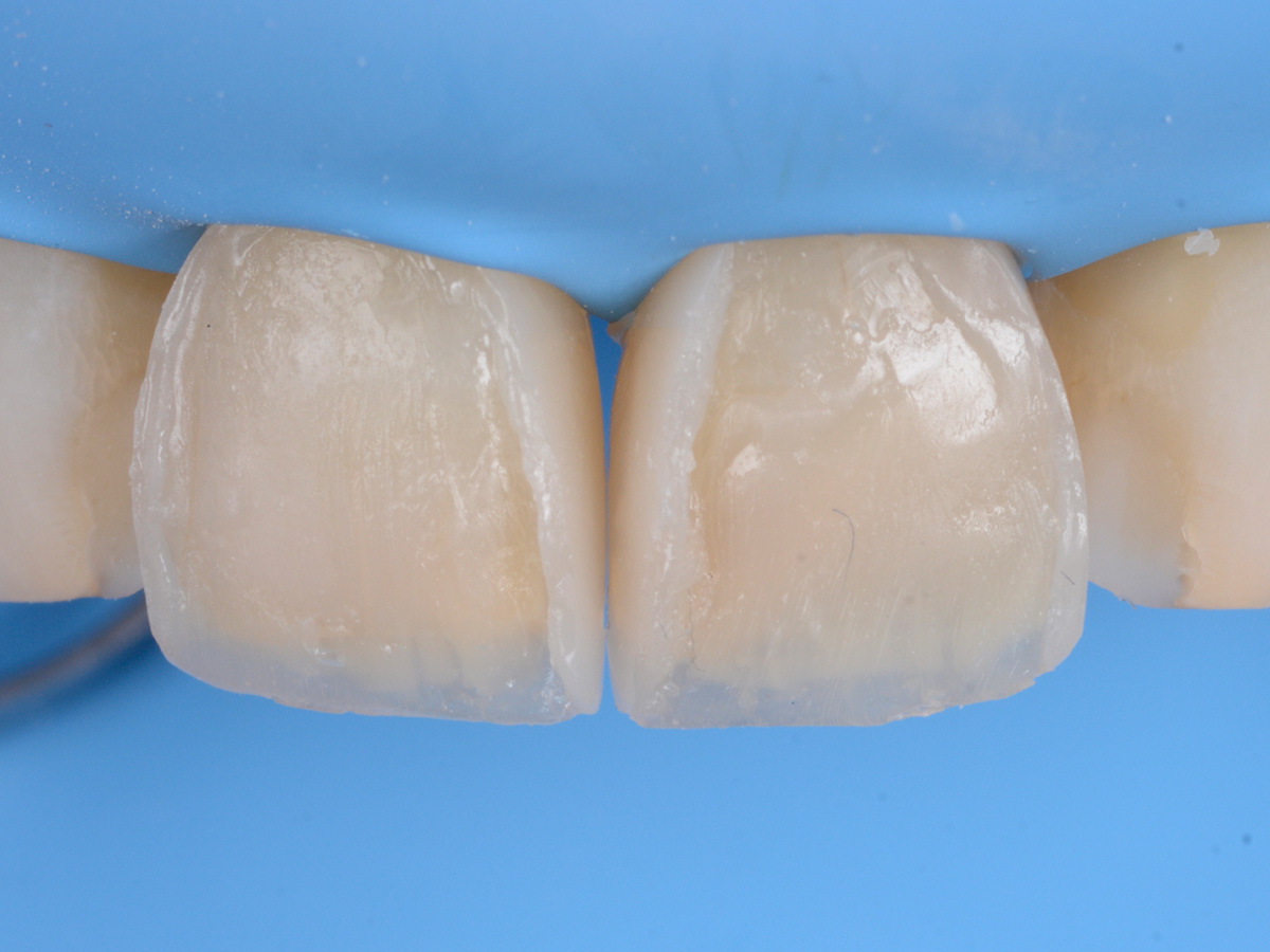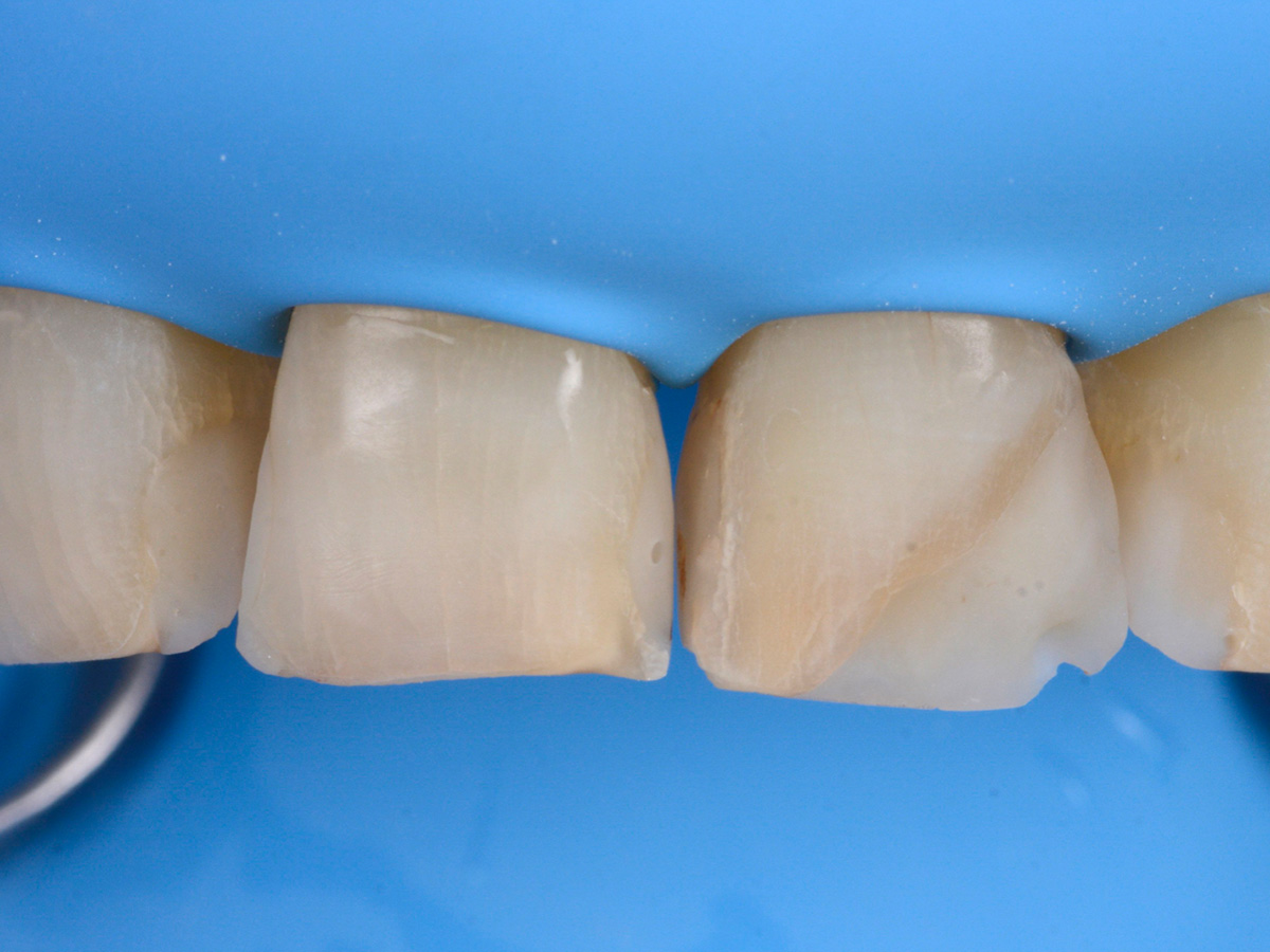 Die klinische Situation nach Aufbau der approximalen Wände am Schneidezahn 21: Zuerst wurde ein Universal-Adhäsivsystem verwendet, um die Haftkräfte im Schmelz zu erhöhen, bevor die Behandlung mit dem Aufbau der mesialen und distalen Approximalwand durch direkte Schichtung von Schmelz-Komposit fortgesetzt wurde. Dasselbe Verfahren wurde anschließend am zweiten mittleren Schneidezahn durchgeführt.