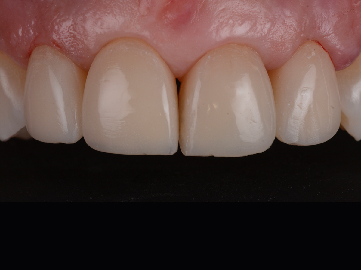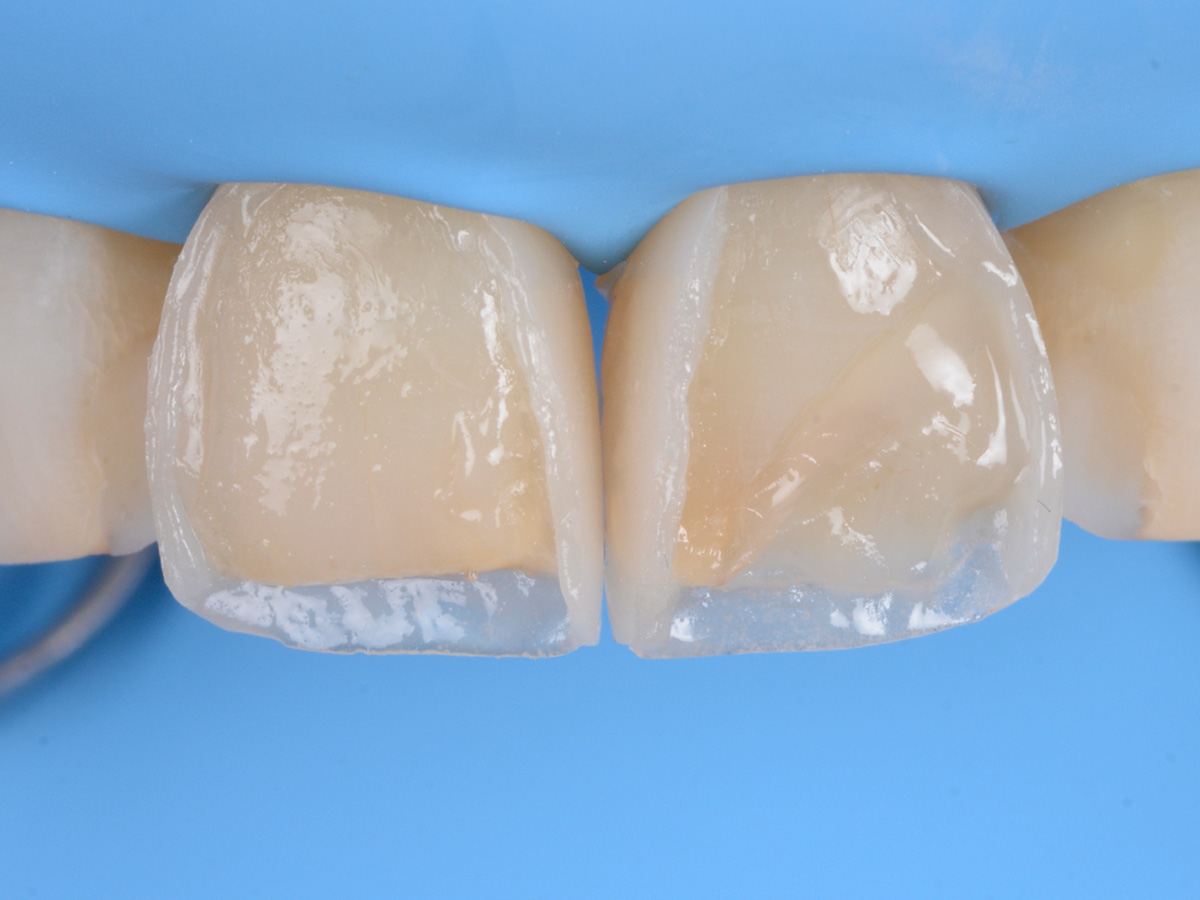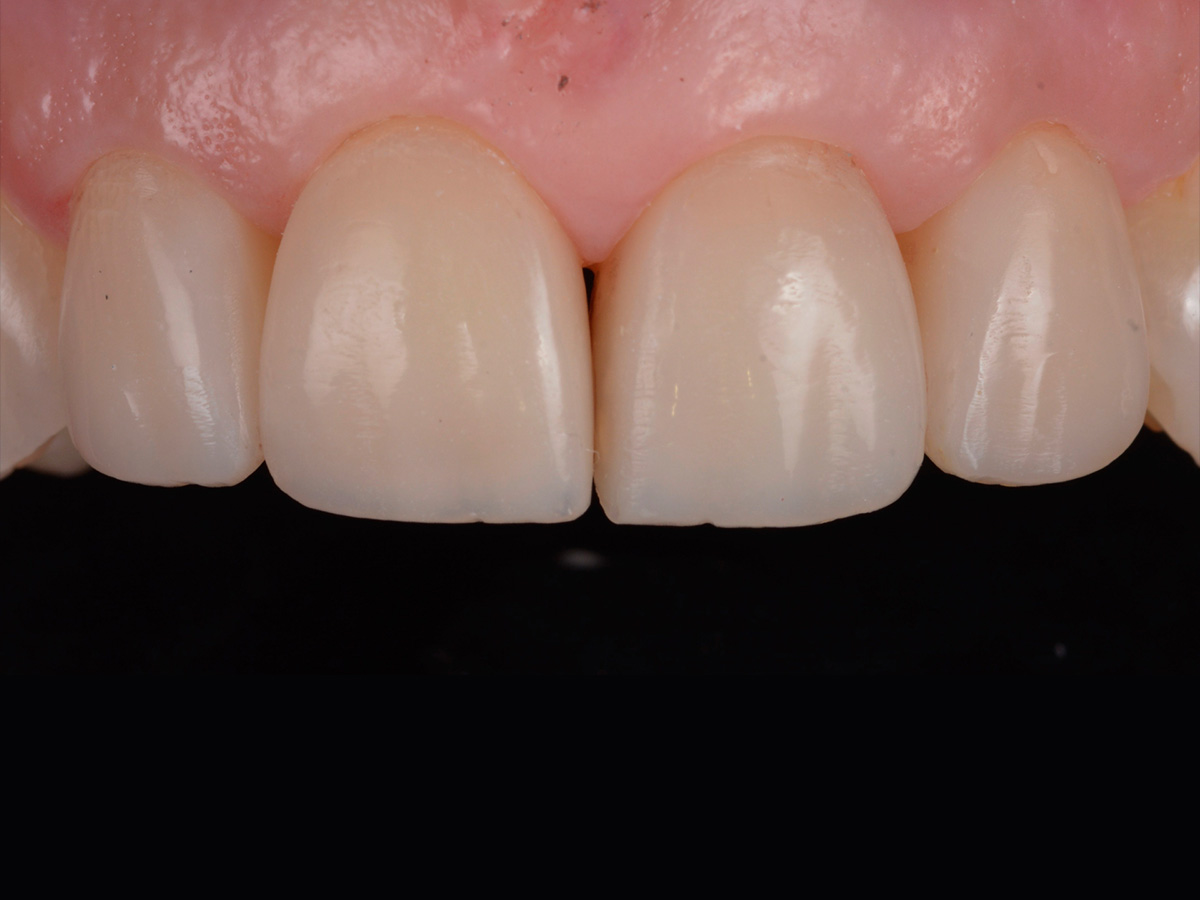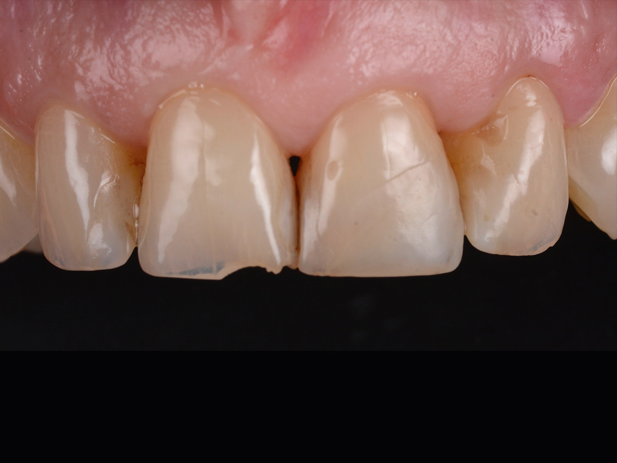 Die klinische Situation nach Aufbau der approximalen Wände am Schneidezahn 21: Zuerst wurde ein Universal-Adhäsivsystem verwendet, um die Haftkräfte im Schmelz zu erhöhen, bevor die Behandlung mit dem Aufbau der mesialen und distalen Approximalwand durch direkte Schichtung von Schmelz-Komposit fortgesetzt wurde. Dasselbe Verfahren wurde anschließend am zweiten mittleren Schneidezahn durchgeführt.