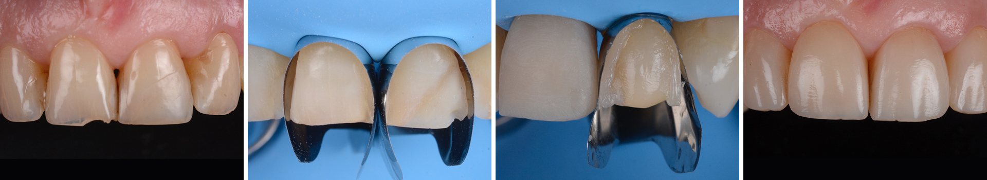 Die direkte Schichtung von Komposit- Verblendungen besteht in der direkten Applikation einer oder mehrerer Schichten Komposit-Kunststoff auf die Zahnstruktur. Das Komposit wird dann zur Farbkorrektur und zum Defektausgleich ausgeformt, sodass eine ästhetische Restauration generell in einer einzigen Behandlungssitzung erreicht werden kann (8). Zur Wiederherstellung der korrekten Form und des Emergenzprofils der Frontzähne können verschiedene Instrumente und Hilfsmittel verwendet werden. Bis heute wurden direkt geschichtete Komposit- Verblendungen am häufigsten bei der Restauration der approximalen und zervikalen Ränder eingesetzt. Dabei erfolgte die Restauration in zwei Schritten mit zwei Seitenzahnmatrizen (approximale Ränder) und einem Matrizenband, das für die Restauration des zervikalen Bereichs in eine spezifische Form zurechtgeschnitten wurde.