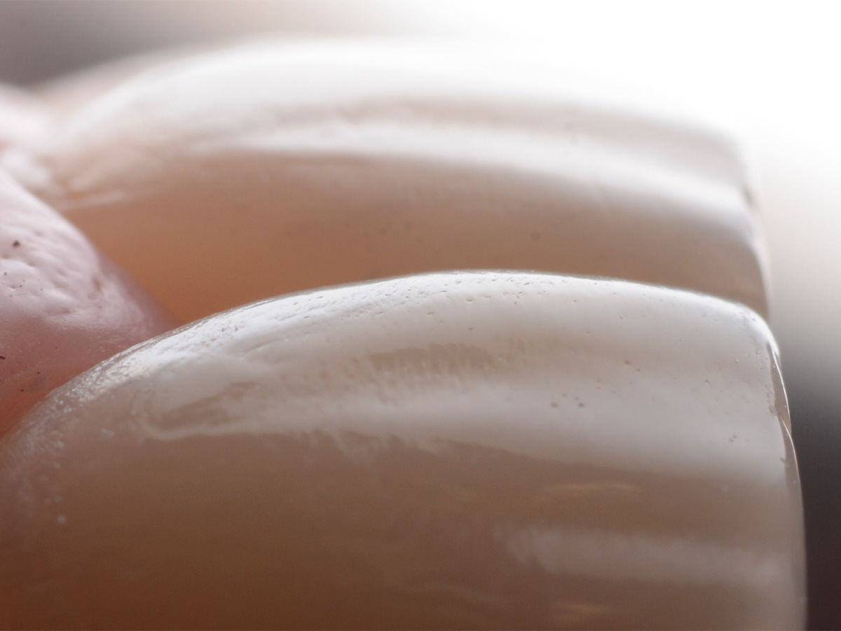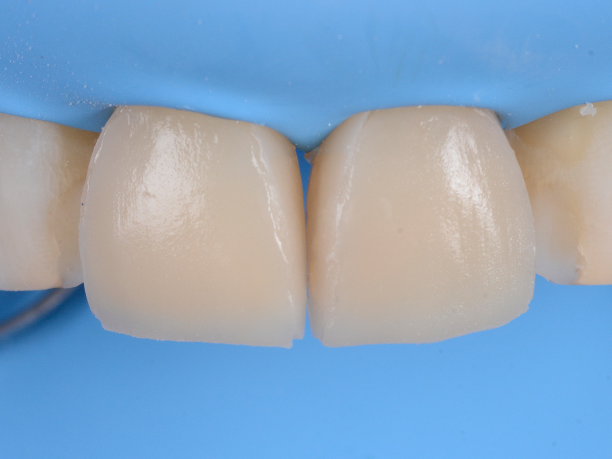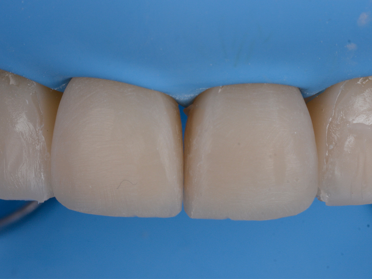 Das Bild zeigt die Komposit-Verblendungen auf den beiden seitlichen Schneidezähnen 12 und 22 vor dem Konturieren, Finieren und Polieren. Die Konturierung und das Finieren wurden mit einem Diamantfräser bei niedriger Drehzahl durchgeführt. Die niedrige Drehzahl ermöglicht eine besser zu kontrollierende Bewegung und verbessert die Oberflächenglätte, selbst bei grober Korngröße. Die Vorpolitur wurde anschließend mit einem braunen Spiralrad (3M, Deutschland) und Polierpaste (Premier, Diamond Twist SCL) durchgeführt. Für die Hochglanz-Politur beim Finieren kann ein Schwabbelrad verwendet werden.