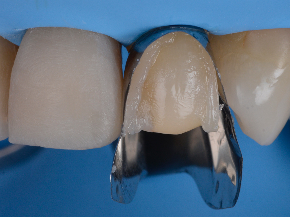 Aufbau des Emergenzprofils auf Schneidezahn 22. Nach Lichthärtung des Materials wird die Matrize separiert und zur besseren Sicht abgezogen.
