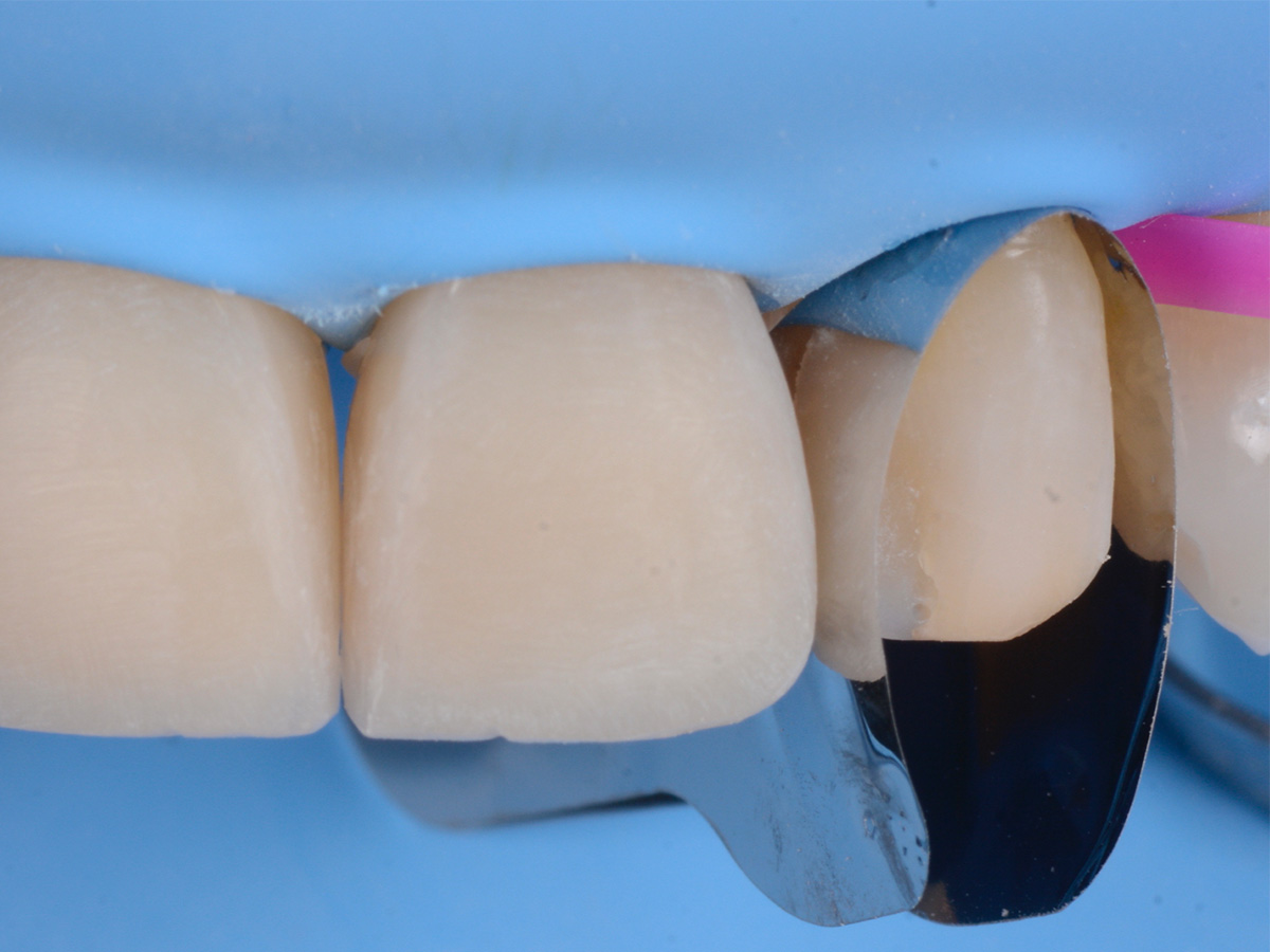 Das isolierte Gebiet nach Reinigung, Desinfektion und Polieren der Zahnoberflächen. Zur Wiederherstellung des Emergenzprofils der Frontzähne können verschiedene Methoden angewandt werden. Wir entschieden uns für die Verwendung der Frontzahnmatrize Unica anterior von Polydentia, da durch sie das Verfahren vereinfacht und die direkte Restauration des gesamten Emergenzprofils (zervikale und approximale Ränder) in nur einem Schritt möglich ist.