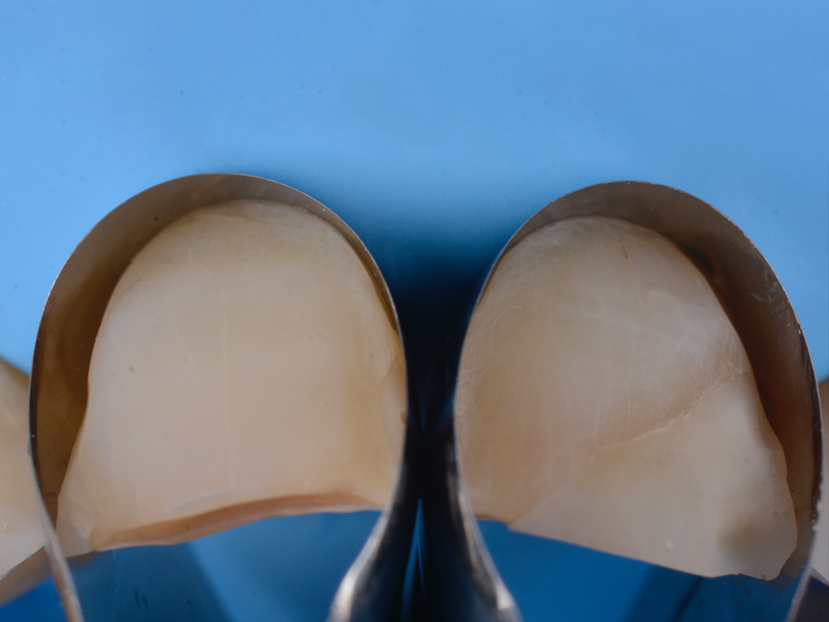Die mittleren Schneidezähne mit den präparierten Flächen in der Ansicht von unten.