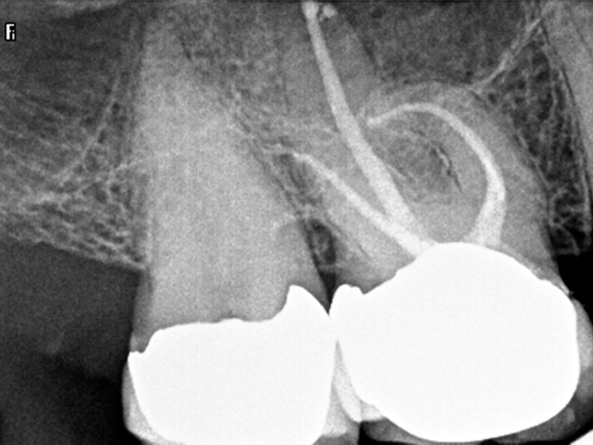 Mesiobukkal wurden zwei Kanäle aufbereitet, die apikal in einem Apex konfluieren.