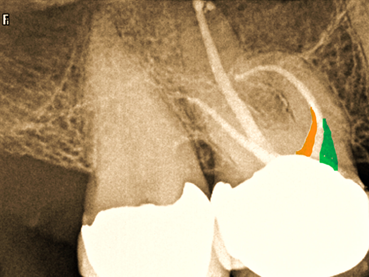 Im koronalen Drittel wurden eine schonende Dentinabtragung (grüner Bereich) und Zugang zum Kanal durchgeführt. MB2 (oranger Bereich).