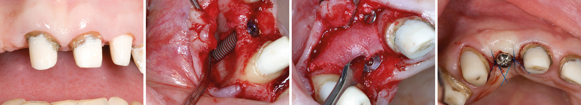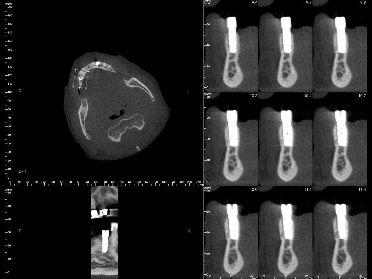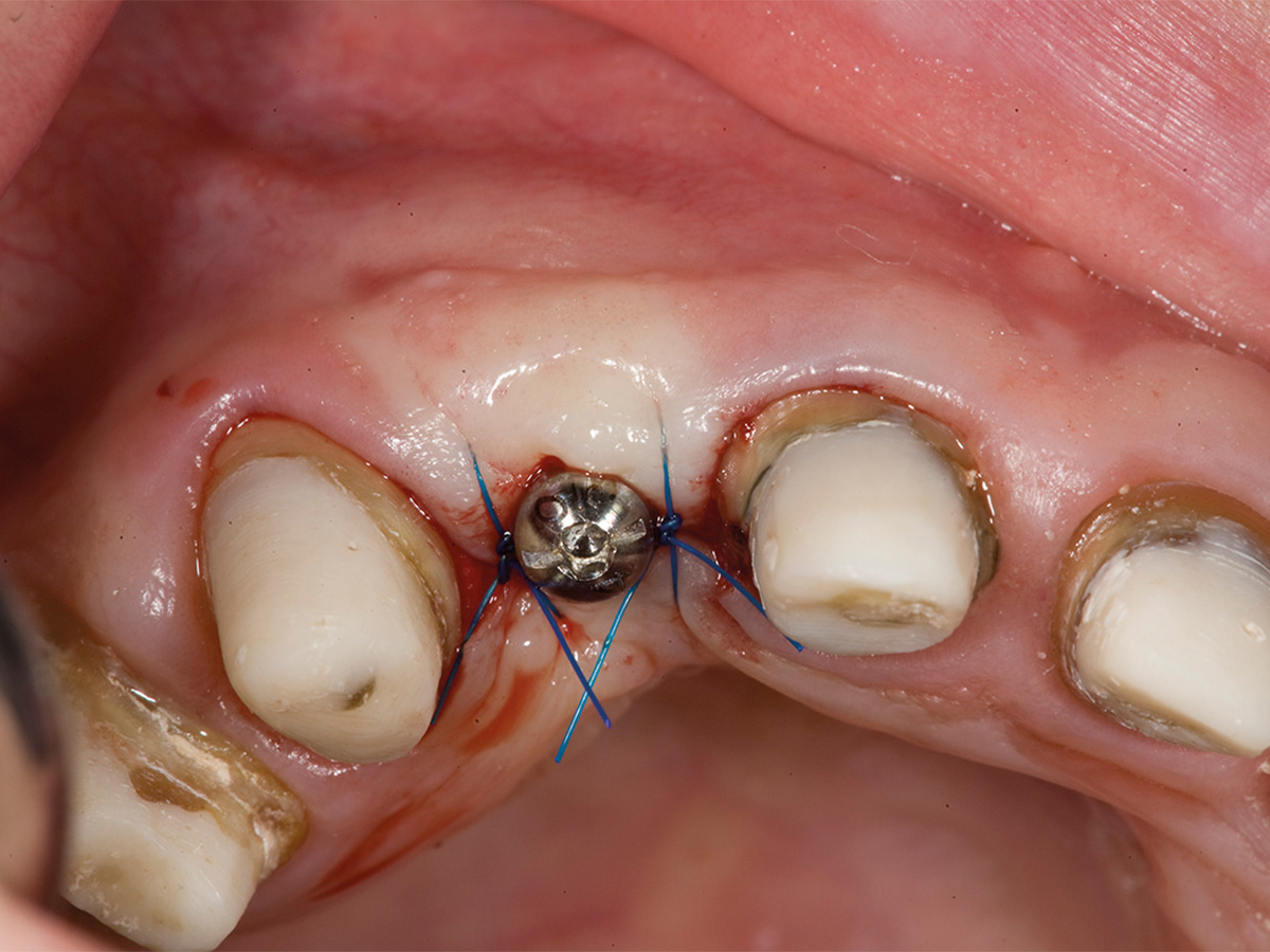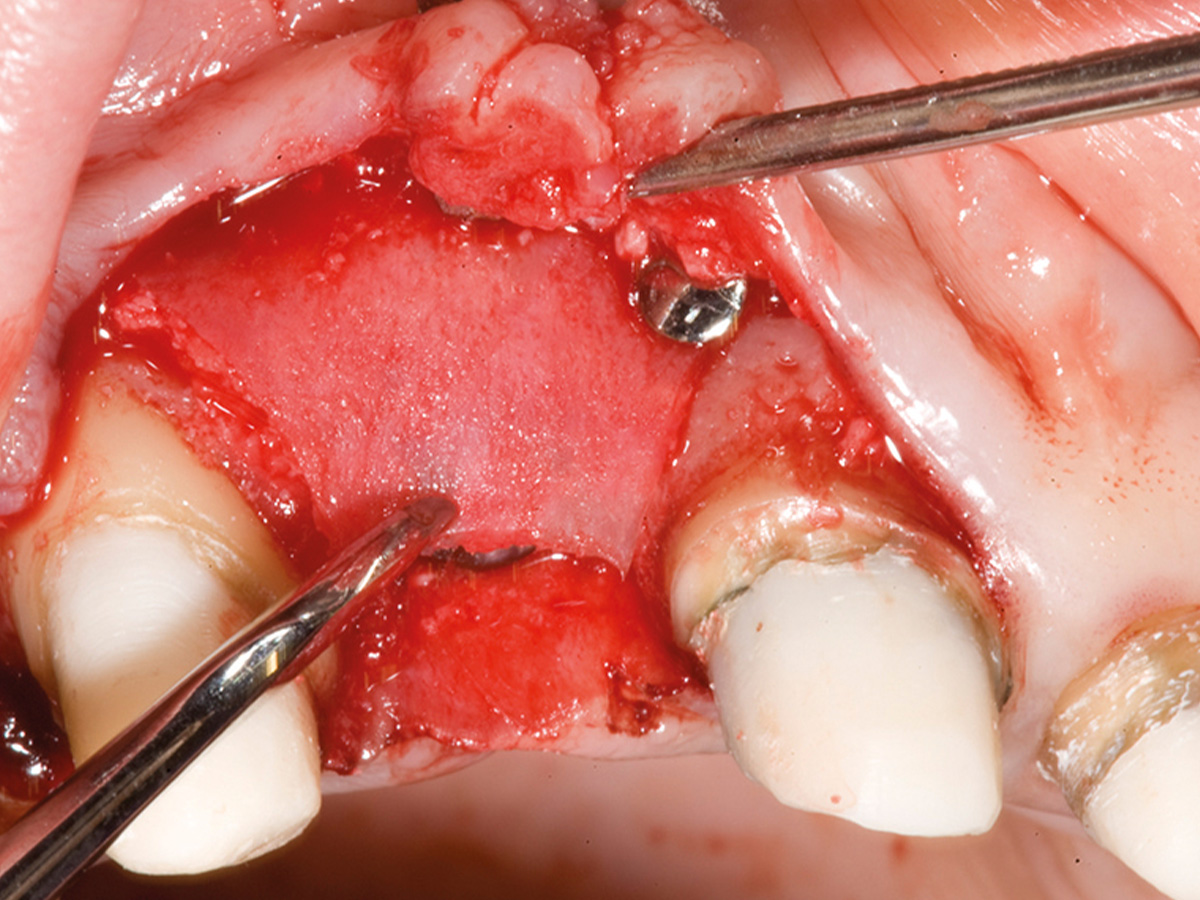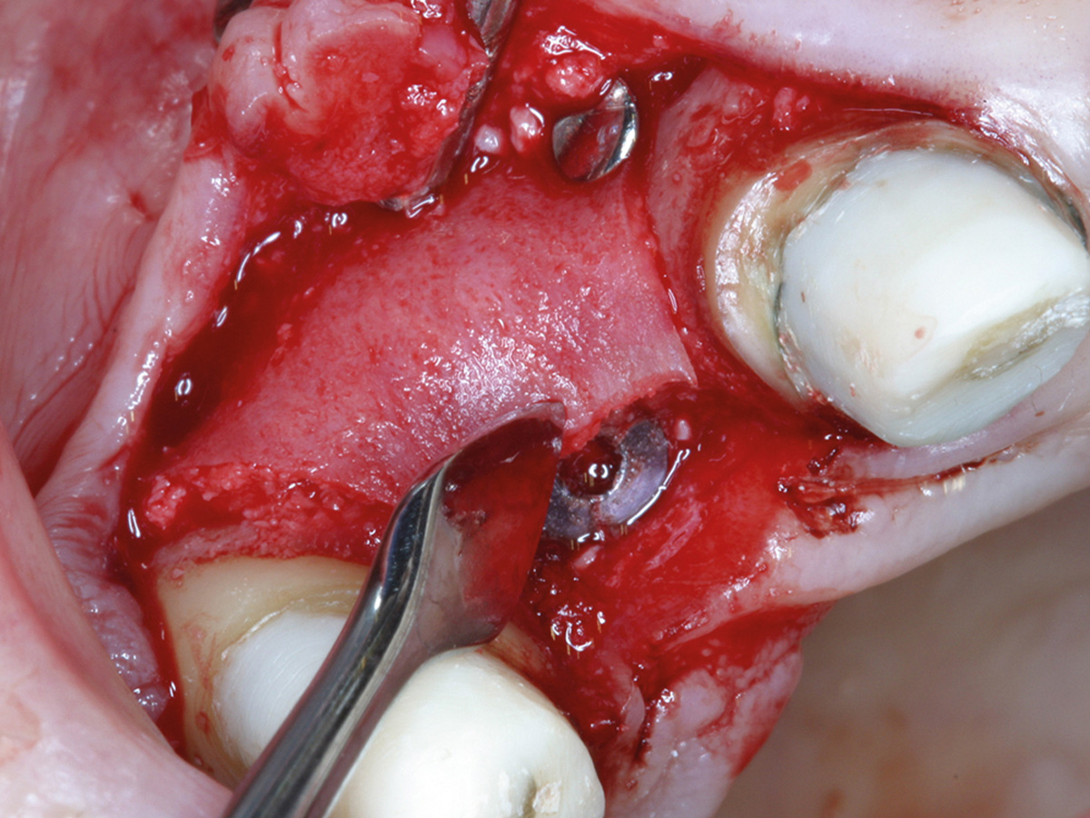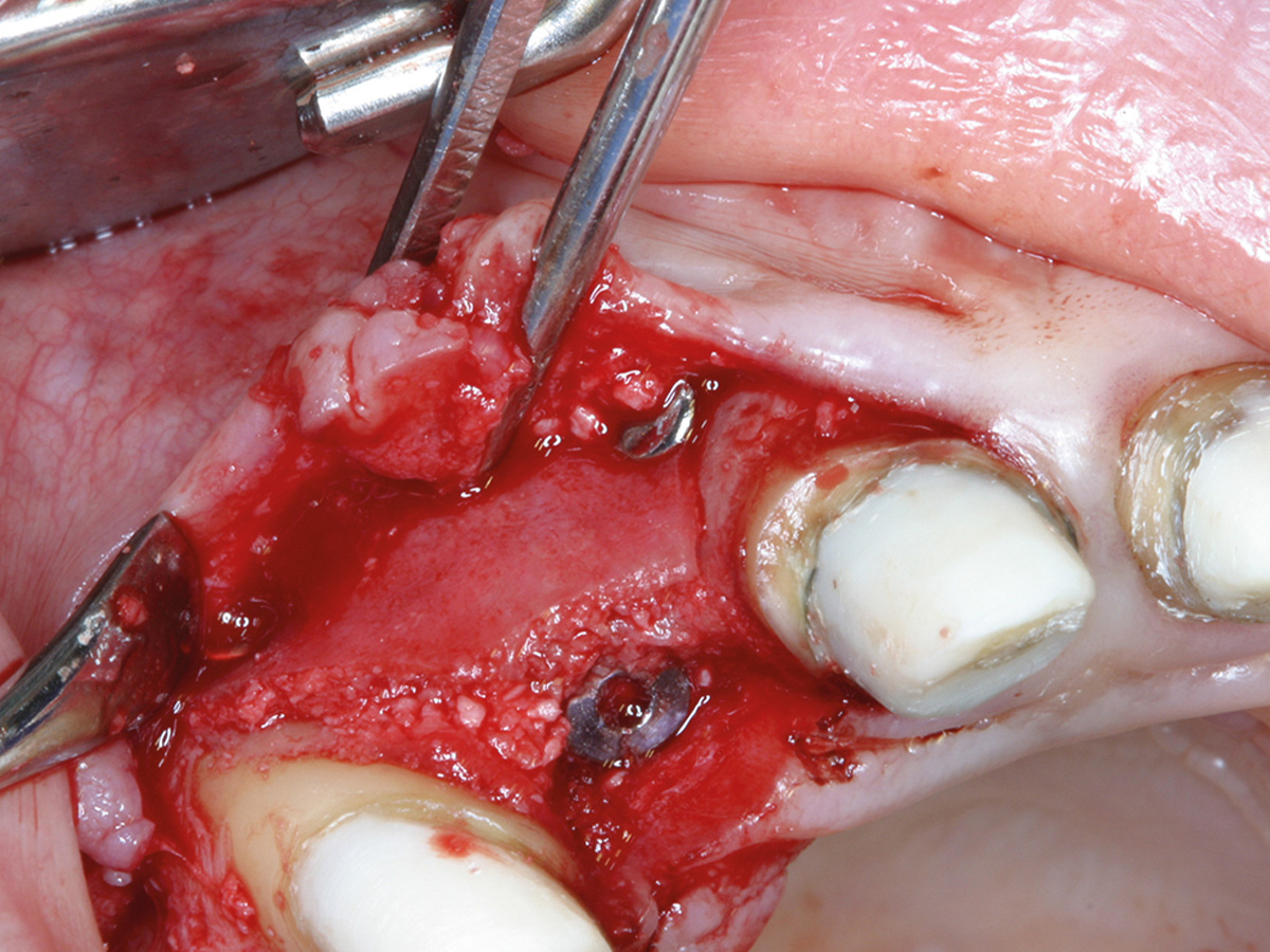 In diesem Fall war bereits aus der präoperativen DVT-Planung ersichtlich, dass die vorhandene Breite des Alveolarkammes zu schmal ist, um ein Implantat mit der Breite 3,25/3,4 Biomet 3i aufzunehmen. Intraoperativ wurde das Implantat so gesetzt, dass es koronal zwar mit einer ca. 2-3 mm breiten Knochenmanschette ummantelt war, der Rest der Implantatzirkumferenz aber außerhalb des Alveolarkammes zu liegen kam. Nach Anfrischung des periimplantären kortikalen Knochenbettes mit Rosenbohrern wurde eine Bone Lamina angepasst und mit zwei Frioss-Nägeln stabilisiert. Der dadurch entstandene Hohlraum wurde mit mp3 aufgefüllt. 5 Monate postoperativ wurde das Implantat freigelegt und die bukkale Knochenbildung dargestellt.