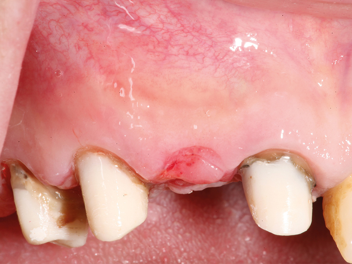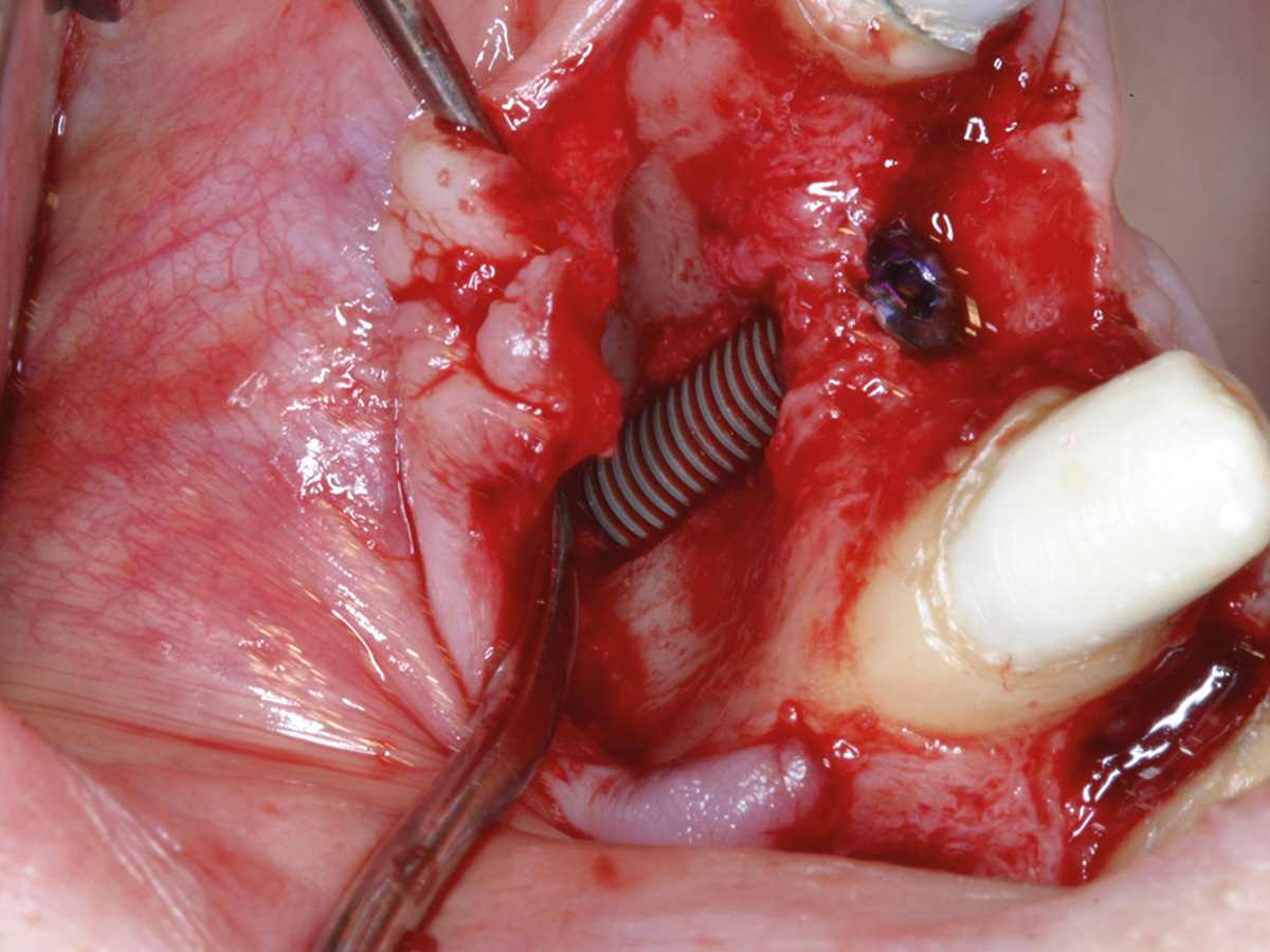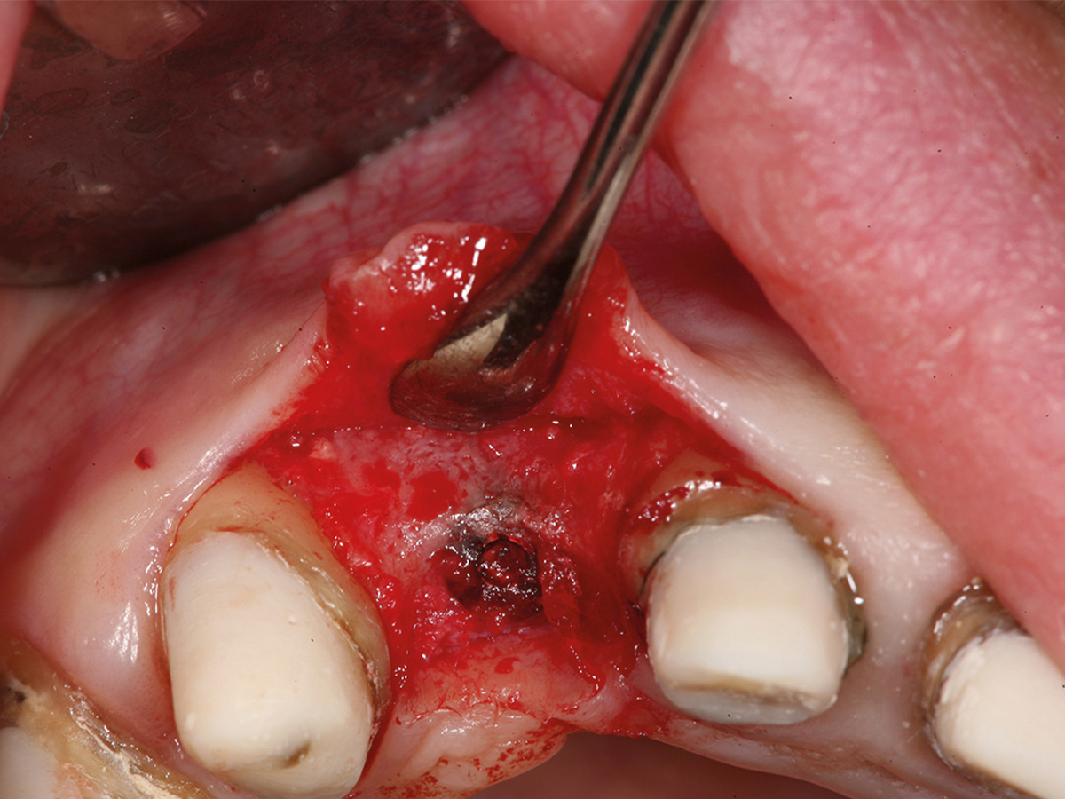 Intraoperative Situation mit koronaler Knochenbrücke und extraalveolär imponierendem Implantat (Biomet 3,2 x 13).