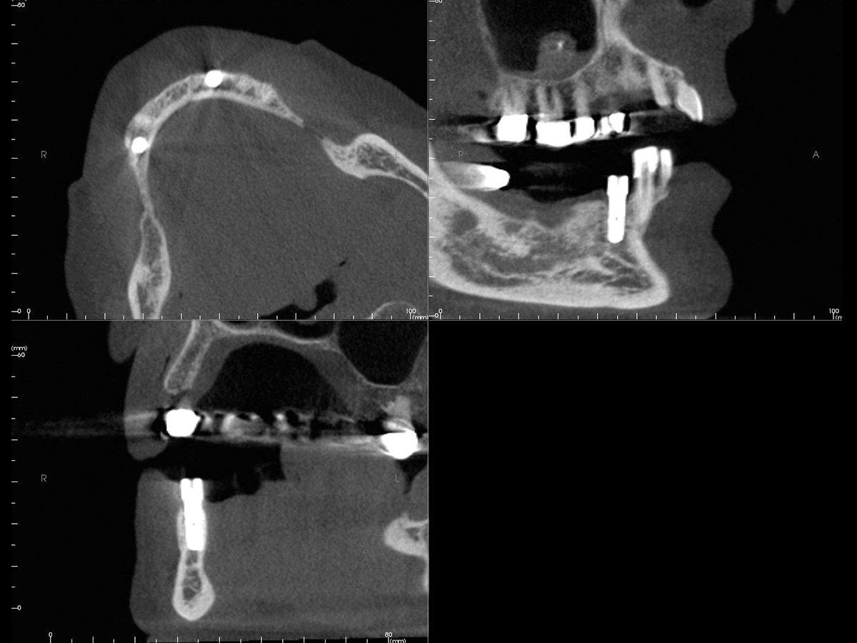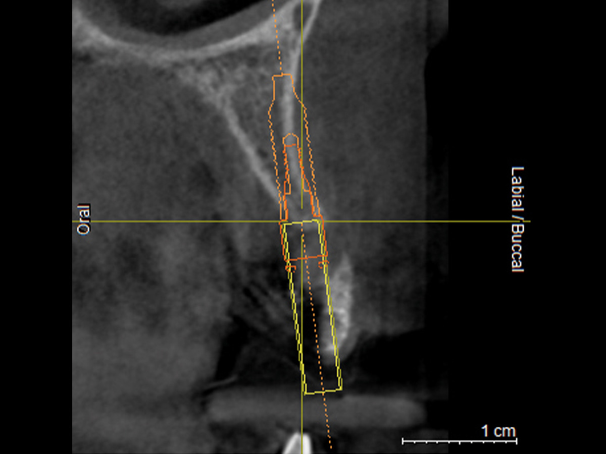 DVT mit Implantatplanung zeigt die atrophe Knochensituation mit geplantem Implantat.