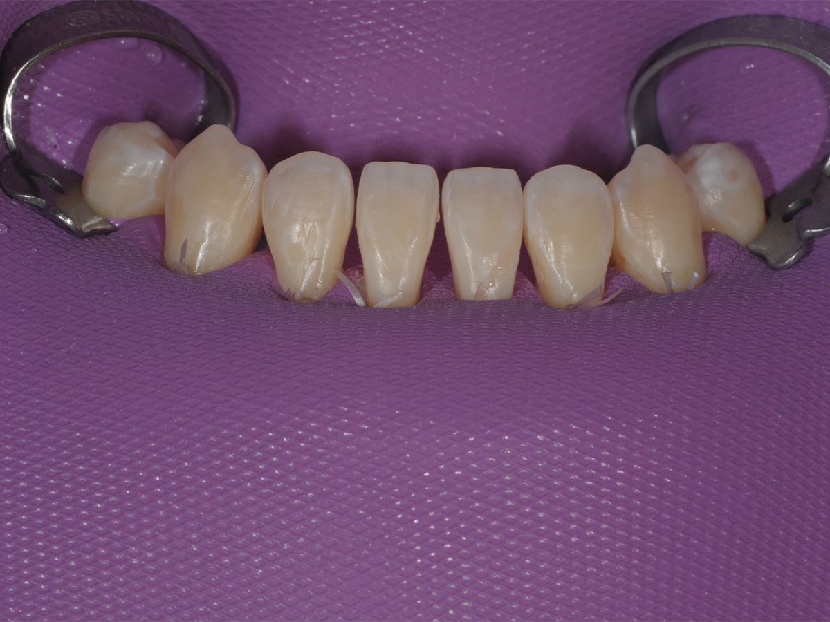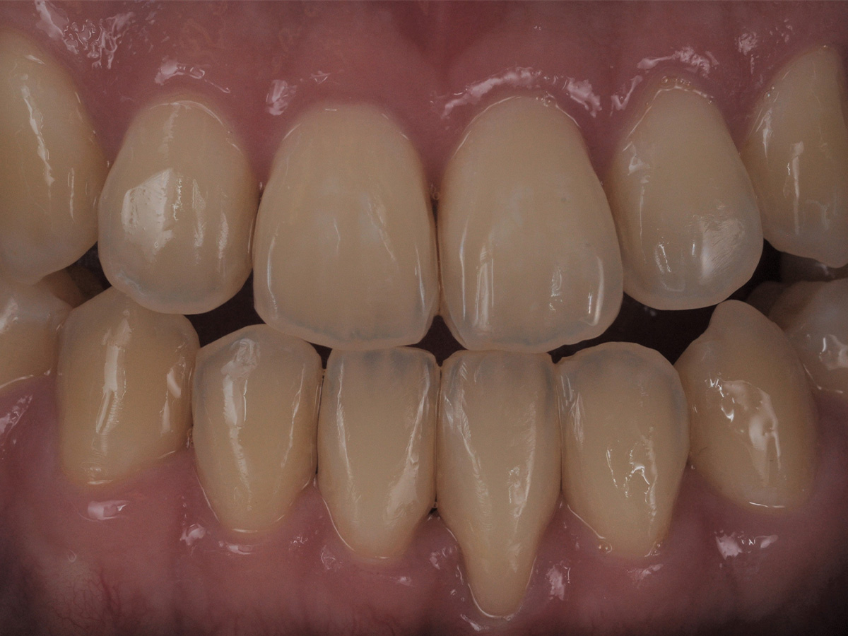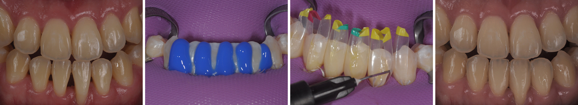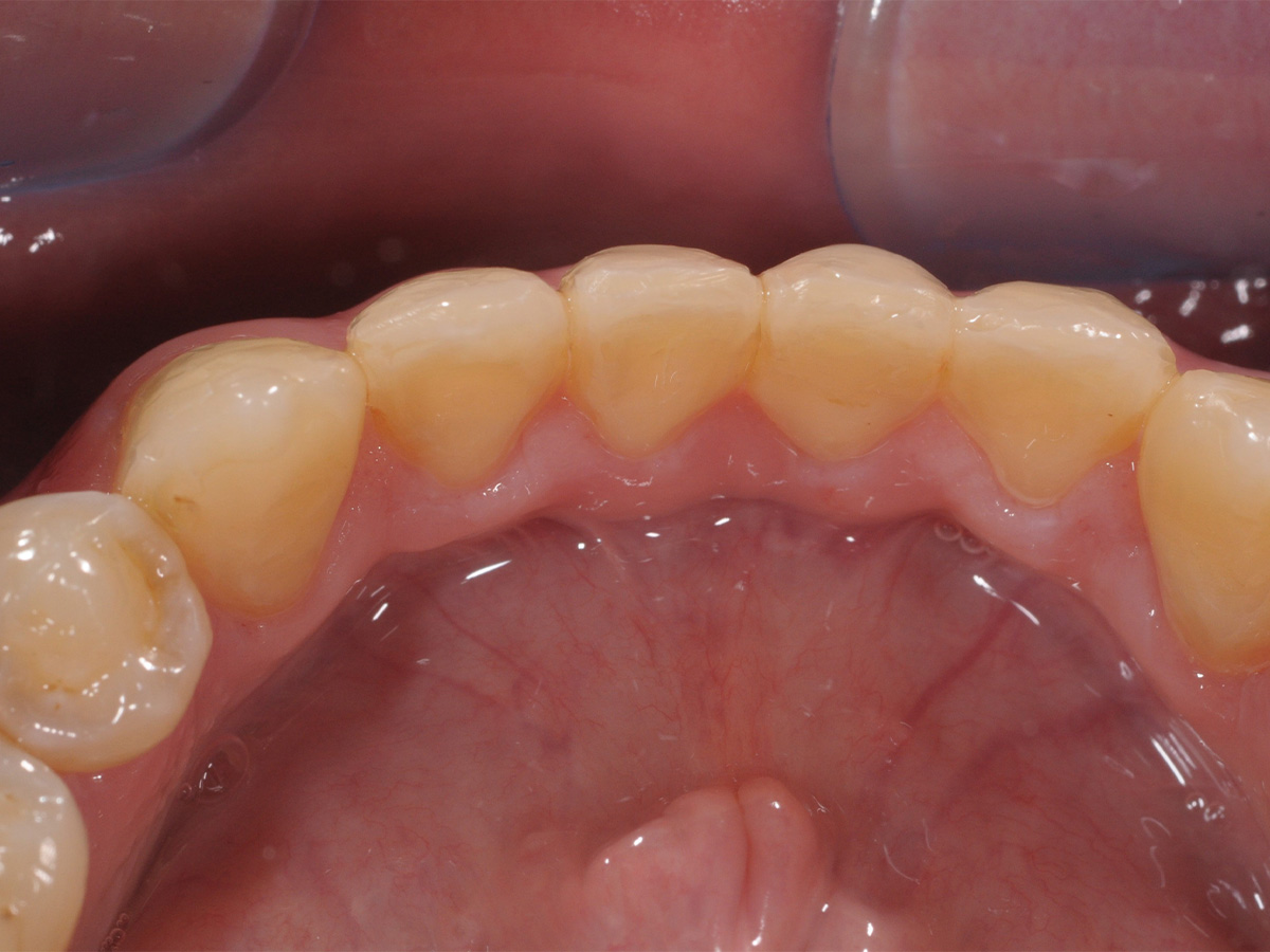 Ziel der Behandlung war es, die Lücken zu schließen, ohne die Zähne zu beschleifen. Der Patient war zum Zeitpunkt der Behandlung parodontal stabil, die Zähne karies- und füllungsfrei. Mittels noninvasivem Komposit-Veneering wurden die schwarzen Dreiecke zahnhartsubstanzschonend geschlossen und ein hochästhetisches und natürlich anmutendes Ergebnis erzielt.Für diese Technik wurden transparente, anatomisch geformte Matrizen sowie ein Komposit-System verwendet..