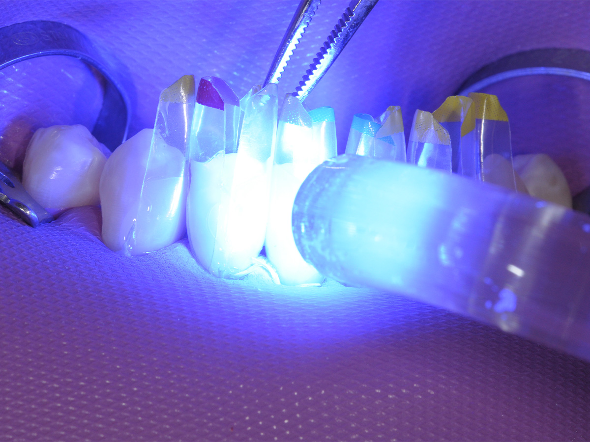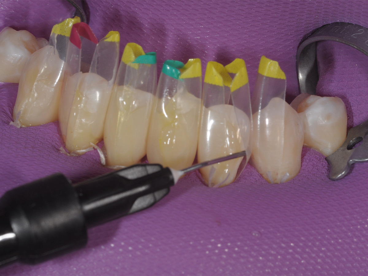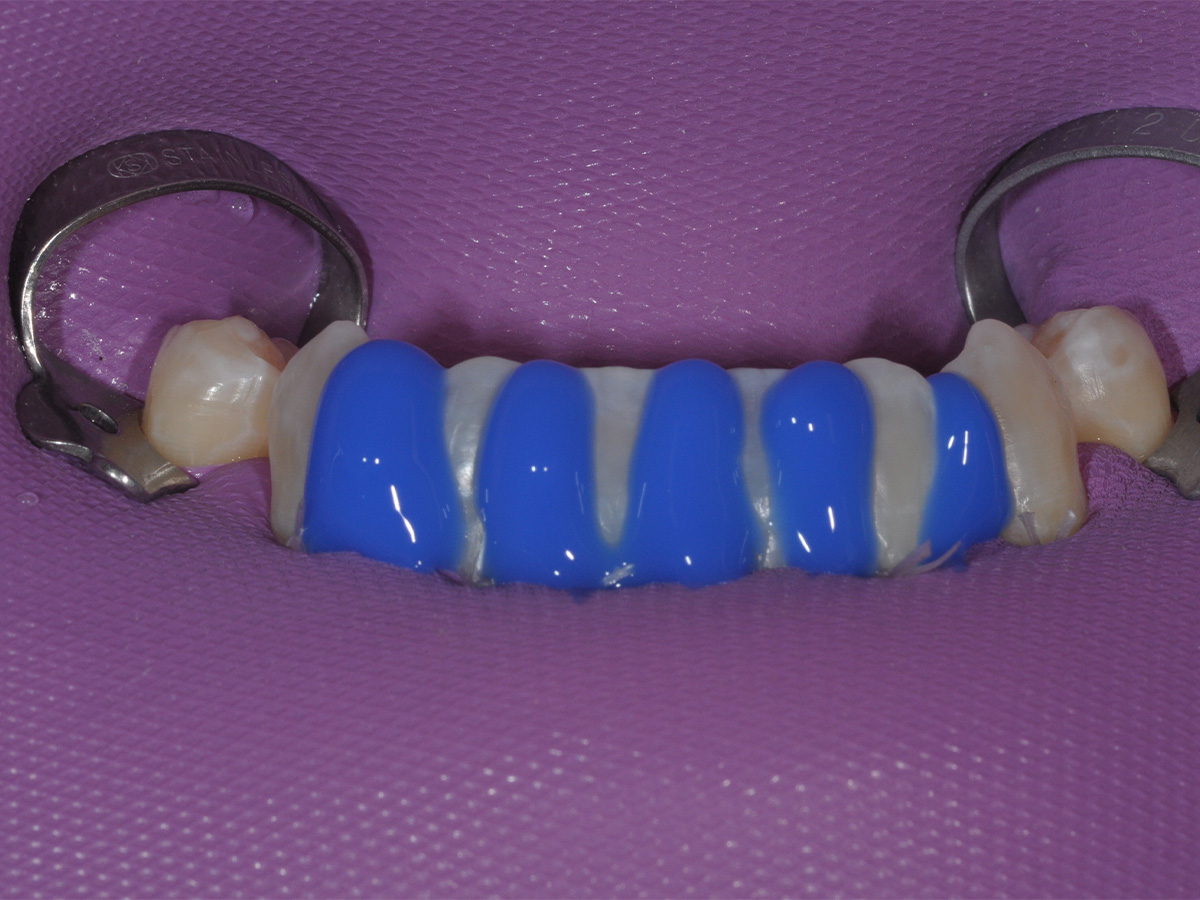 Ziel der Behandlung war es, die Lücken zu schließen, ohne die Zähne zu beschleifen. Der Patient war zum Zeitpunkt der Behandlung parodontal stabil, die Zähne karies- und füllungsfrei. Mittels noninvasivem Komposit-Veneering wurden die schwarzen Dreiecke zahnhartsubstanzschonend geschlossen und ein hochästhetisches und natürlich anmutendes Ergebnis erzielt.Für diese Technik wurden transparente, anatomisch geformte Matrizen sowie ein Komposit-System verwendet..