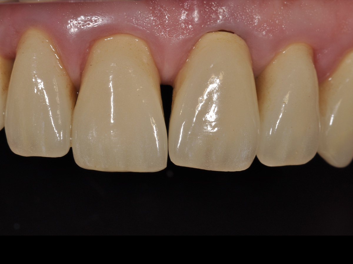 Dieser Fall zeigt, wie Knochendefekte präimplantologisch in vertikaler und horizontaler Dimension einfach und vorhersagbar rekonstruiert werden können. Die vorhandenen Kronen 13-11 und 22-23 verletzen die biologische Breite, weshalb eine chirurgische Kronenverlängerung notwendig wird, um ein perfektes ästhetisches Ergebnis zu erzielen.