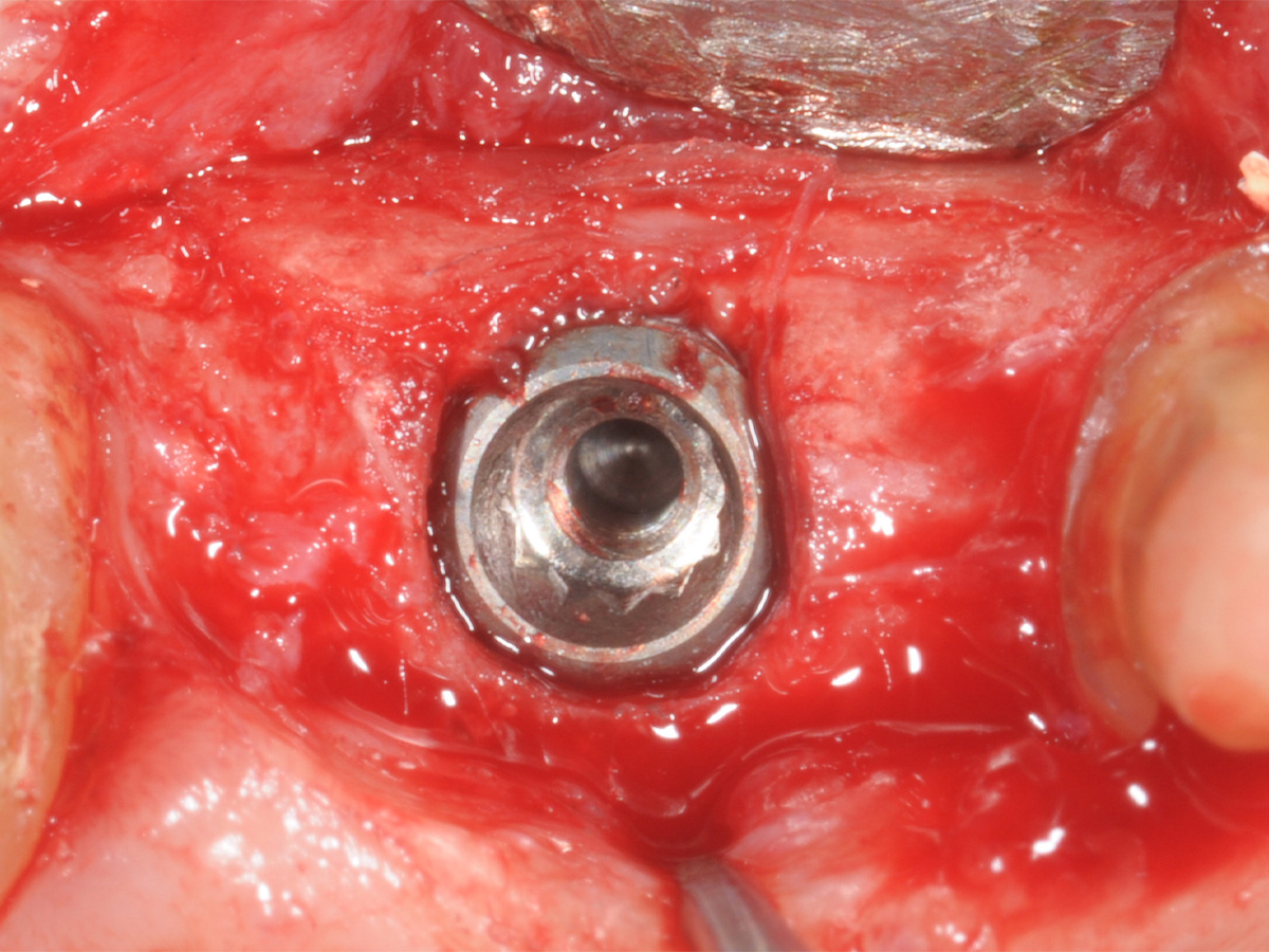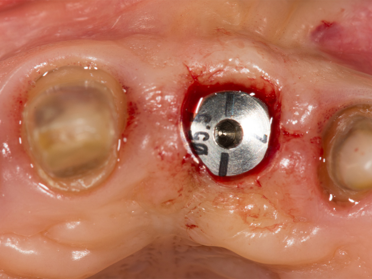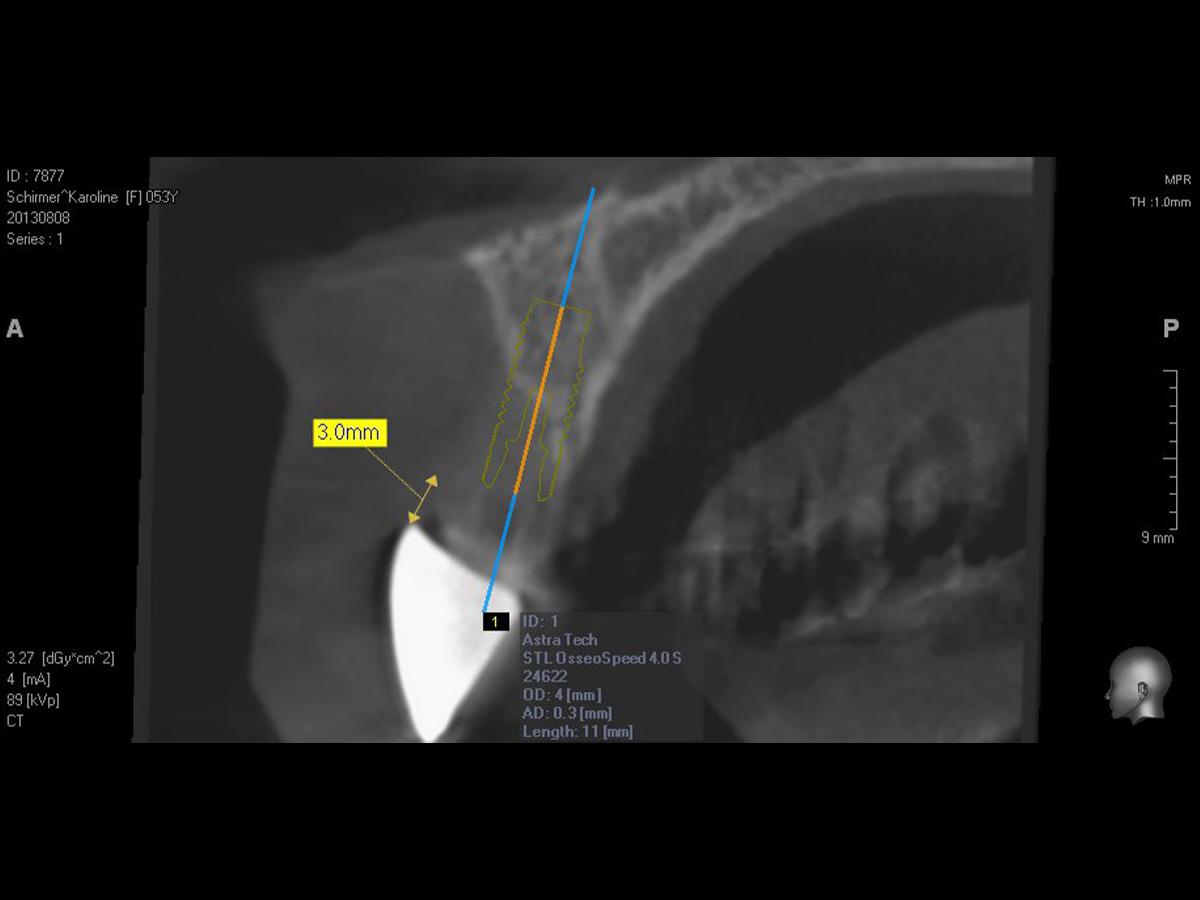 Implantation in optimaler prothetischer Ausrichtung möglich, da ausreichendes knöchernes Angebot in vertikaler und horizontaler Dimension.
