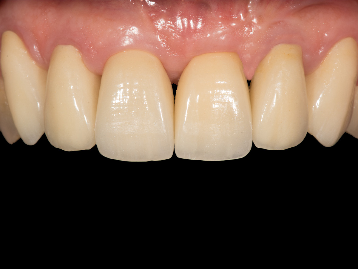 Das Ziel der hier dargestellten Therapie ist die Rekonstruktion mittels Einzelzahnversorgungen in einem biologisch gesunden und stabilen parodontalen Umfeld. Die Grundvoraussetzungen für ein vorhersagbares implantologisches Langzeitergebnis sind eine ausreichend dimensionierte periimplantäre Knochensituation, eine qualitativ und quantitativ perfekte Weichgewebsmanschette und eine hygienefähige Prothetik.