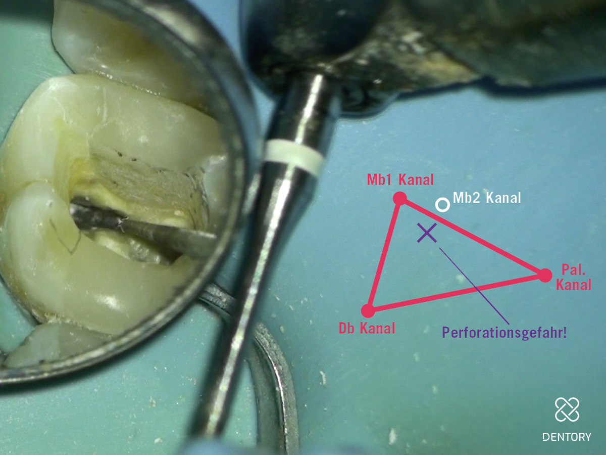 Lokalisierung der Kanäle: Ein feiner, überlanger Rosenbohrer eignet sich für die Suche nach mb2-Kanal besonders gut. Achtung bei der Suche nach mb2-Kanal: Immer mesial der Verbindungslinie des mb1-Kanals und des palantinalen Kanals. Perforationsgefahr nach interradikulär.
