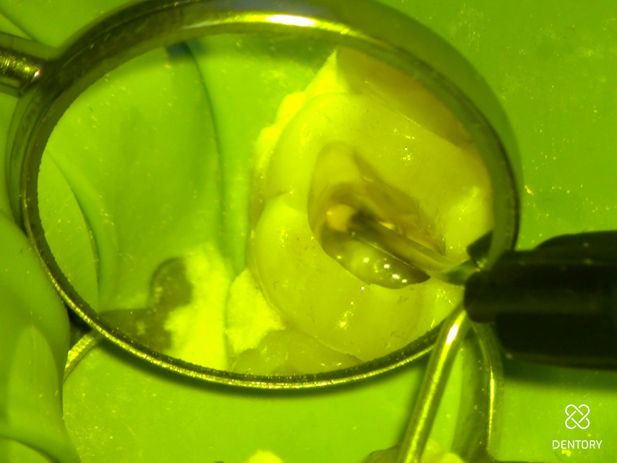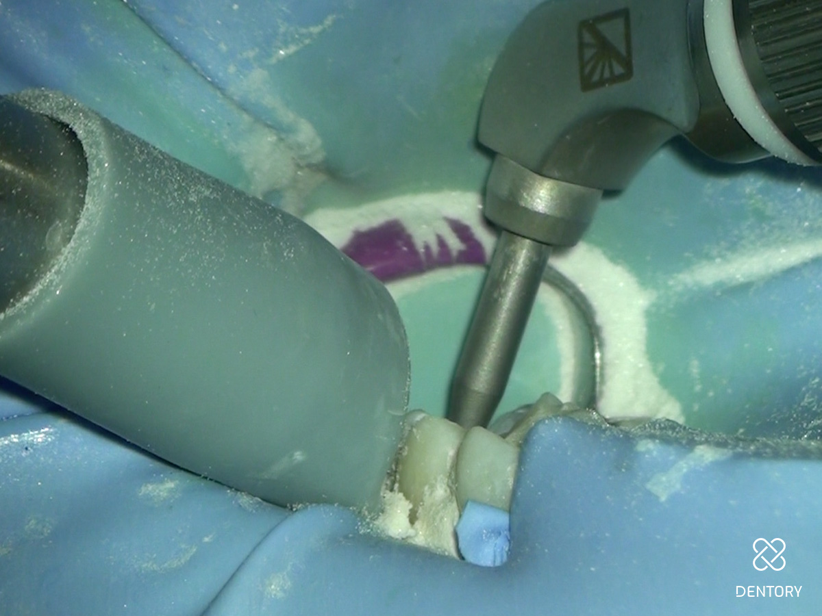 Sealerreste entfernen: Entfernung des verbleibenden Sealers am Pulpenboden und der Pulpakammerwand mit dem Microetcher.