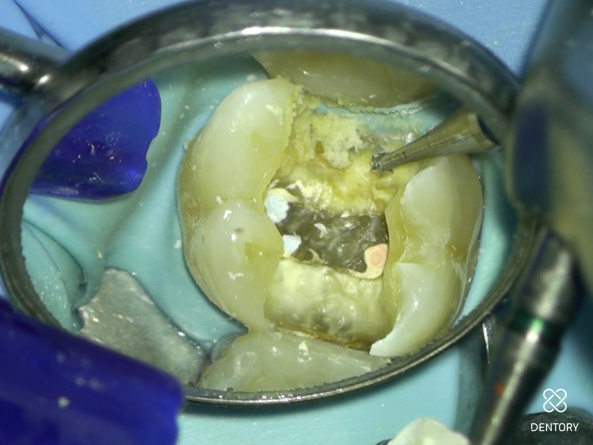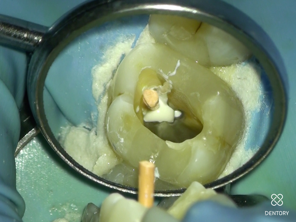 Aufbaufüllung: Versorgung des Zahnes mit einer dichten und stabilen Aufbaufüllung vor Beginn der Wurzelbehandlung. Am besten sind dafür adhäsiv befestigte Kompositfüllungen geeignet.