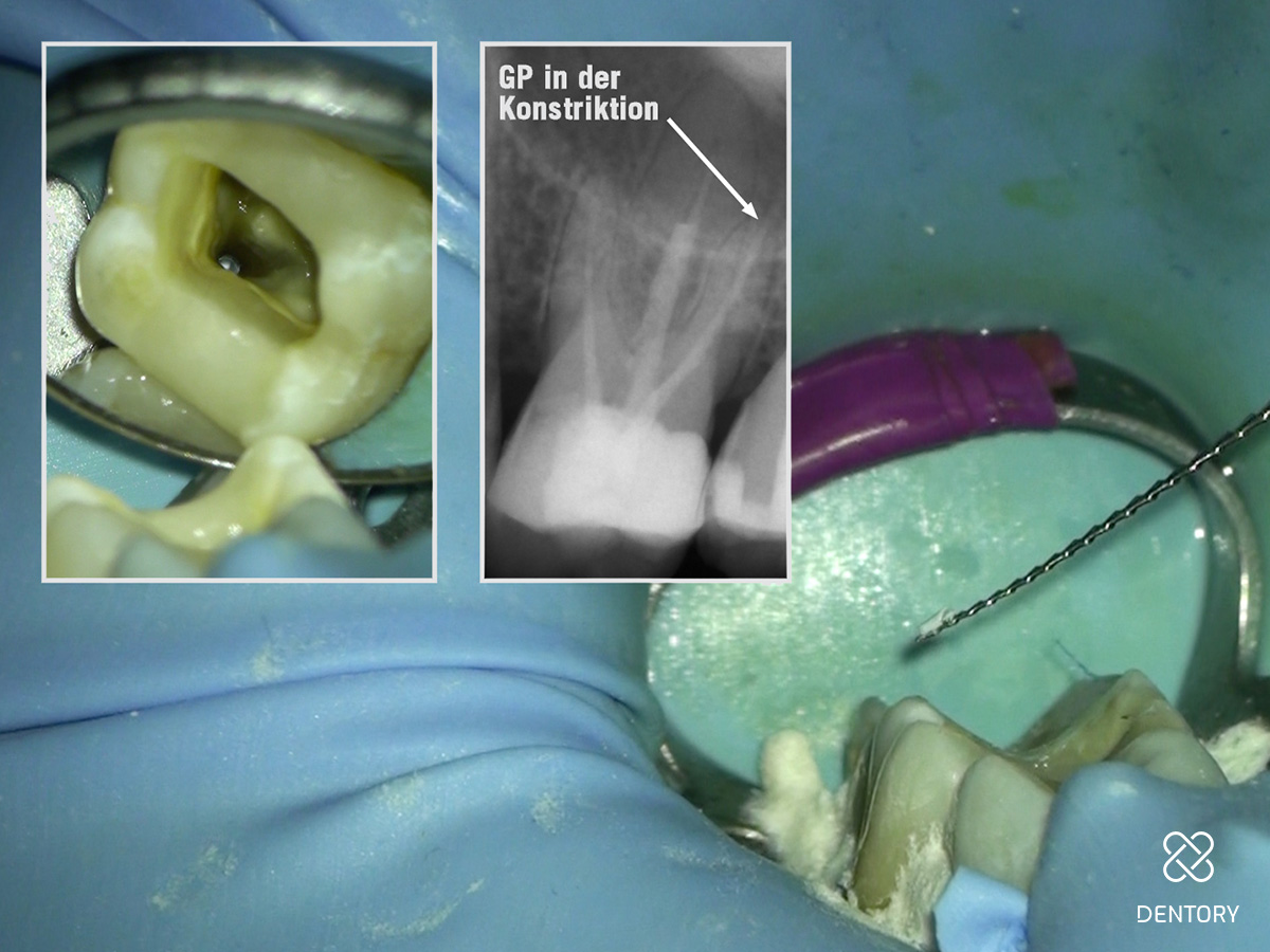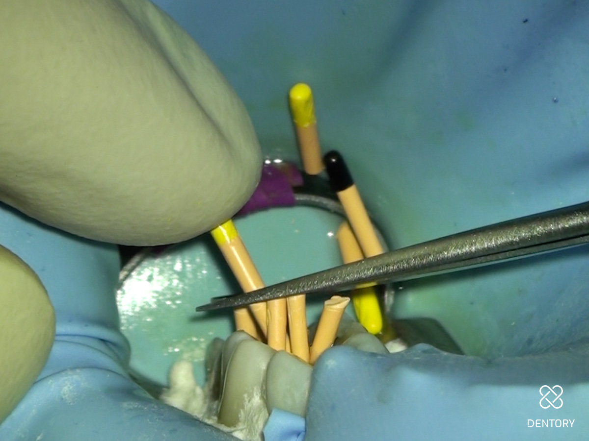 Einprobe der Guttapercha-Spitzen vor der Masterpoint-Aufnahme.