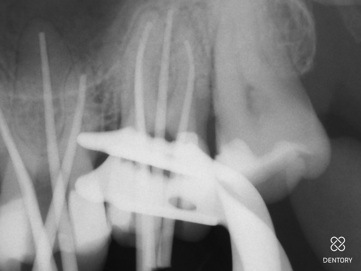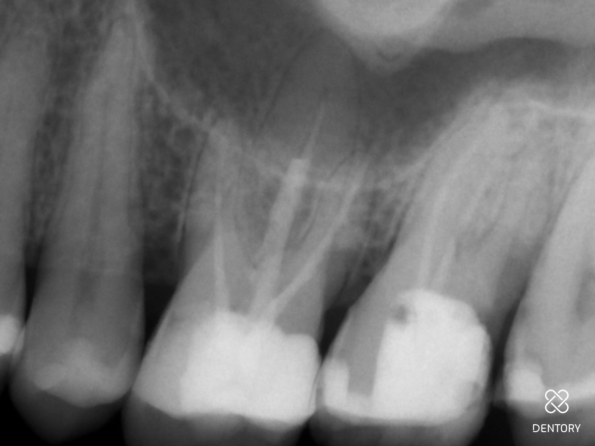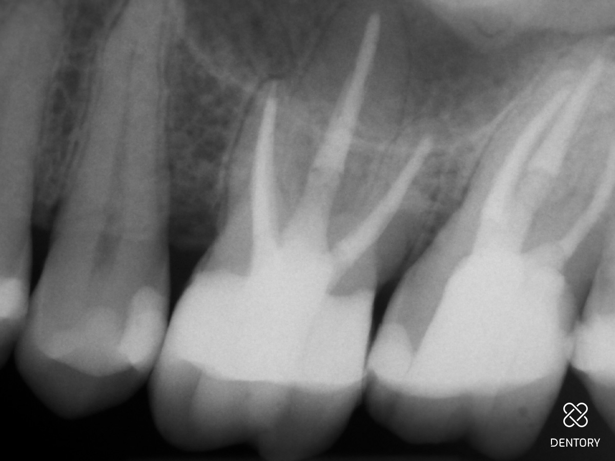 Eine 38-jähirge Patienten stellte sich mit Beschwerden beim Kauen am linken Oberkiefer vor. Die Anamnese ergab insuffiziente Wurzelfüllugen an den Zähnen 26 und 27 und lies eine Sekundärkaries mesial unter der Füllung am Zahn 28 erkennen.
