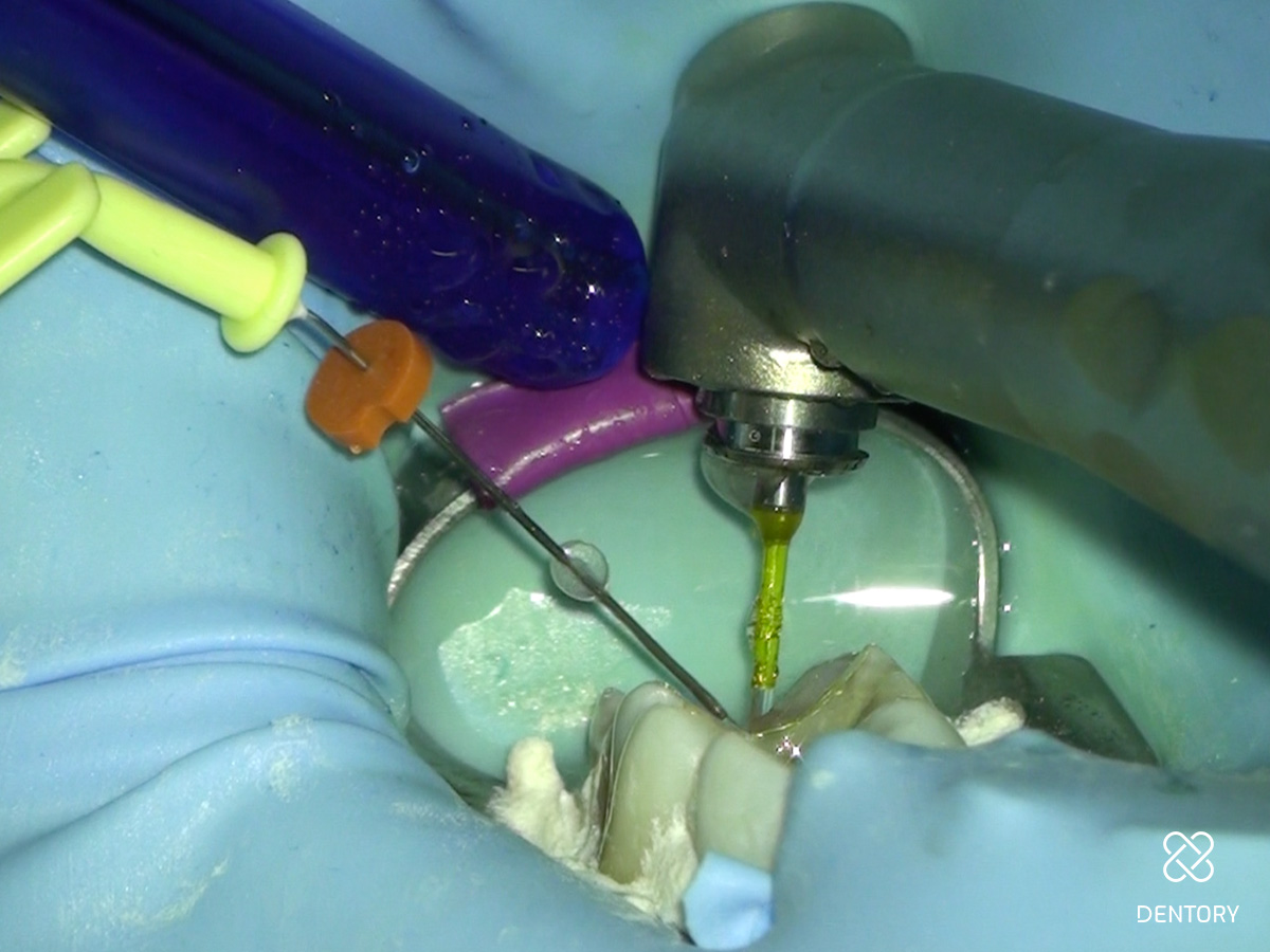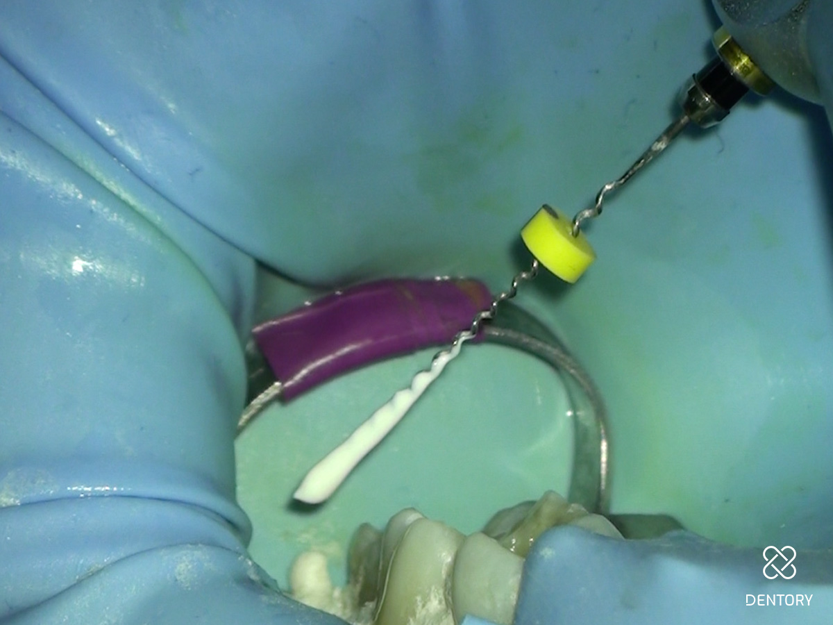 Maschinelle Guttapercha-Entfernung: Entfernung der koronalen Guttapercha mit einer Revisionsfeile nach vorherigem Aufweichen der Guttapercha mit Orangenöl. Die restliche Aufbereitung erfolgt mit NiTi-Feilen.