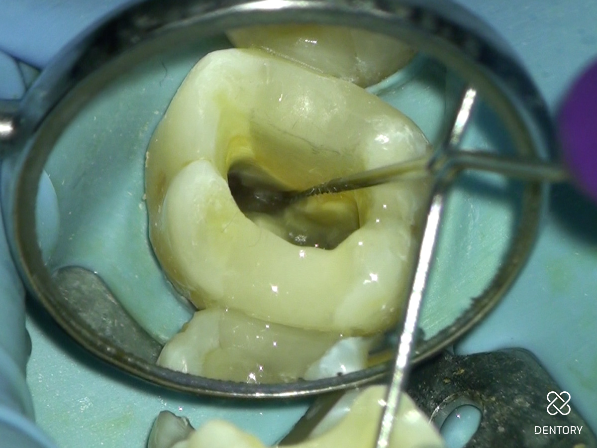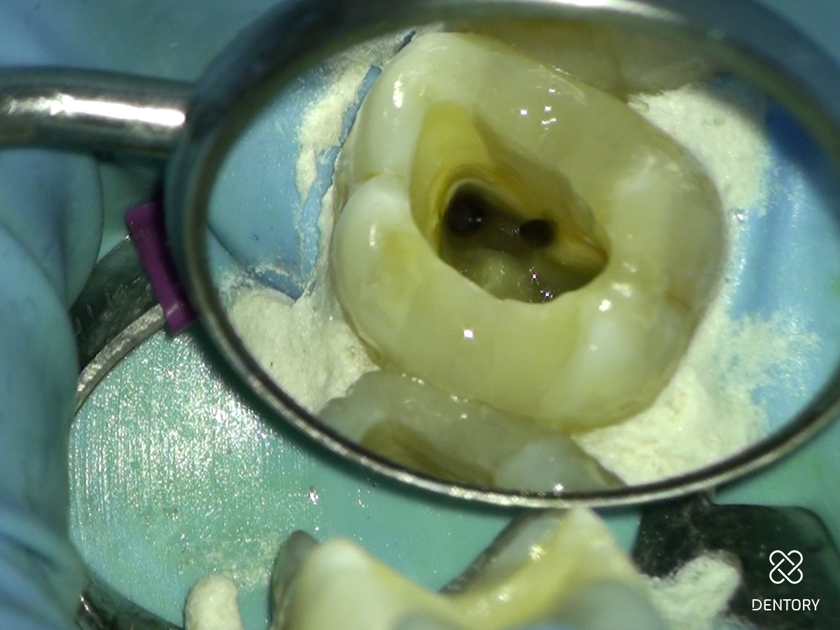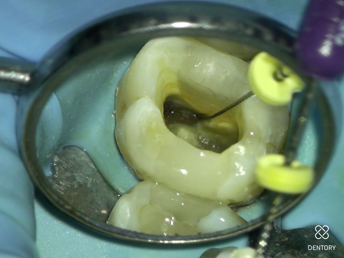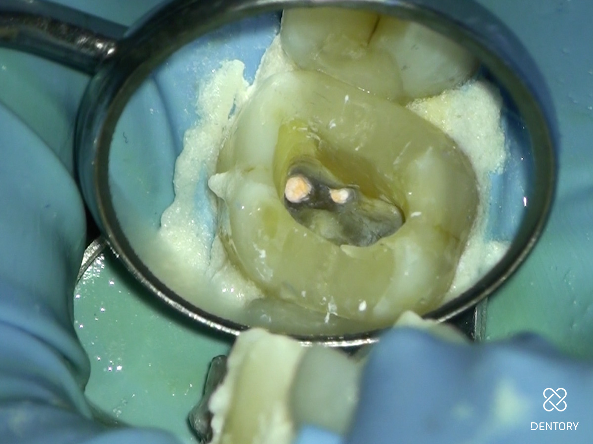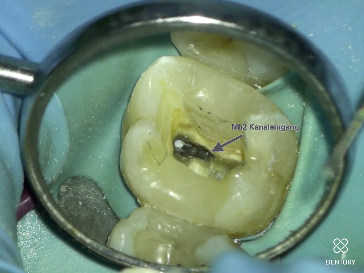 Der weißliche mb2-Kanaleingang hebt sich vom dunkleren Pulpenboden ab.