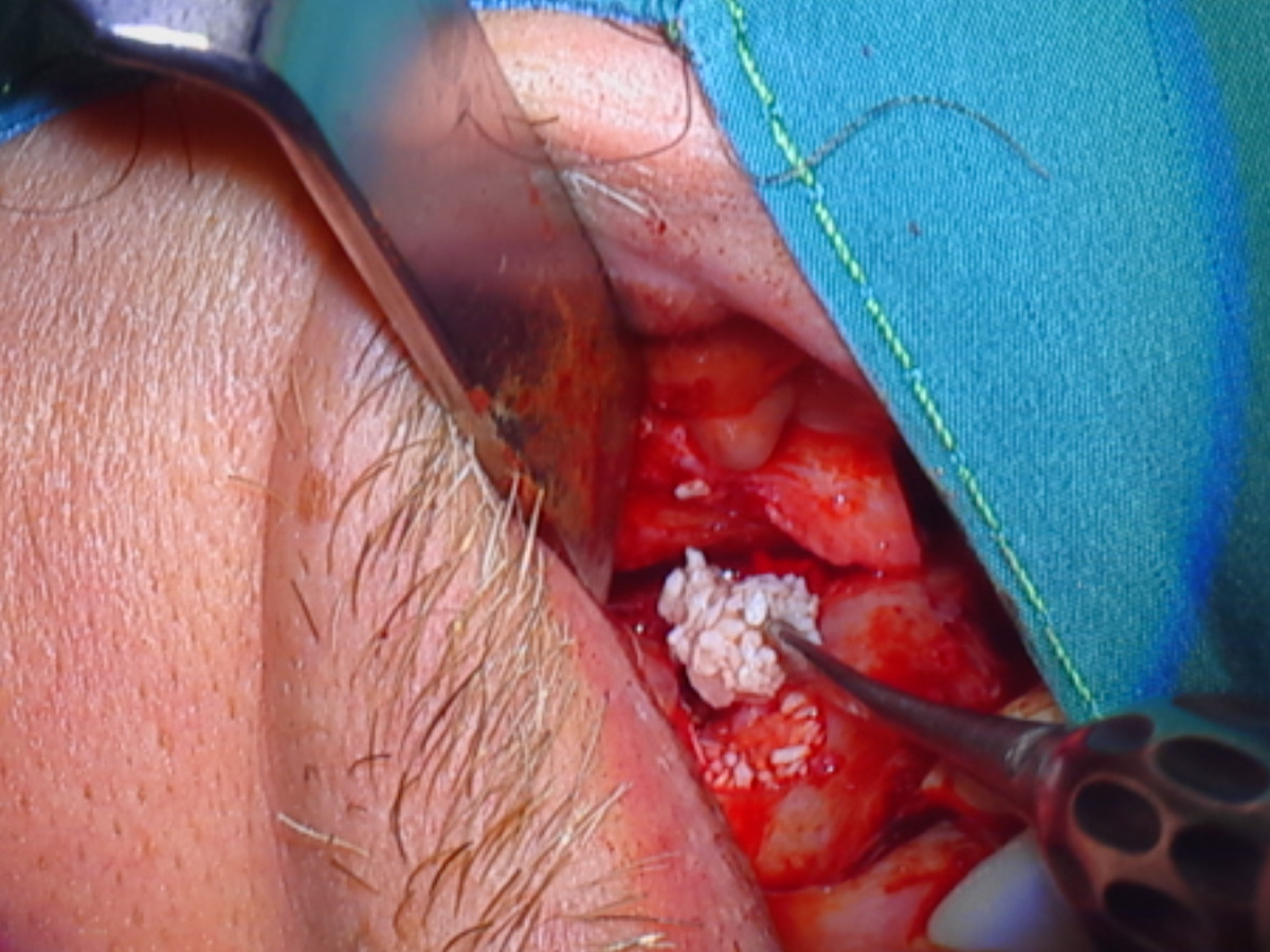Sinusbodenaugementation mit xenogenem Material (Apatos Mix; 10 % Eigenknochen aus Zugangspräparation beigemischt).