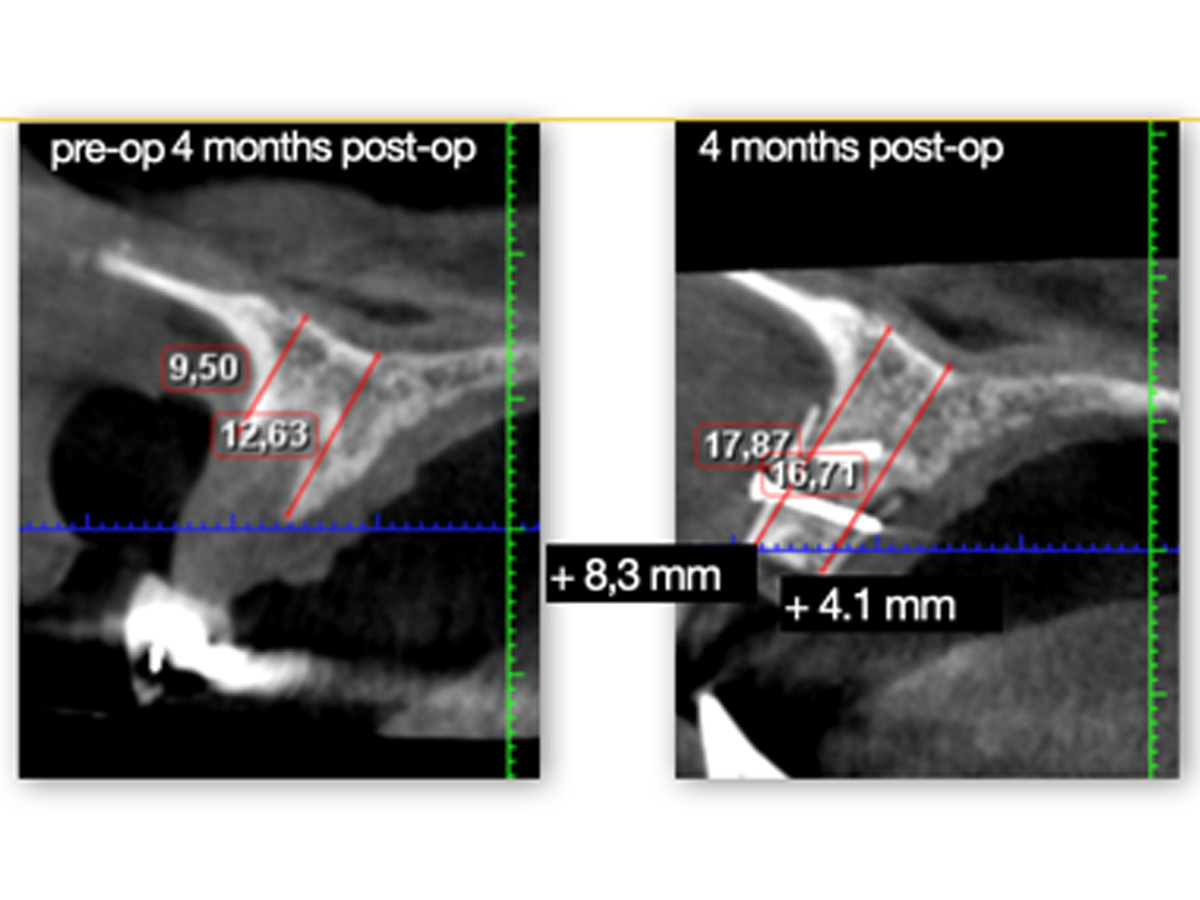 DVT-Schnitt vor und nach dem Eingriff zeigen den Gewinn an augmentiertem Knochen.