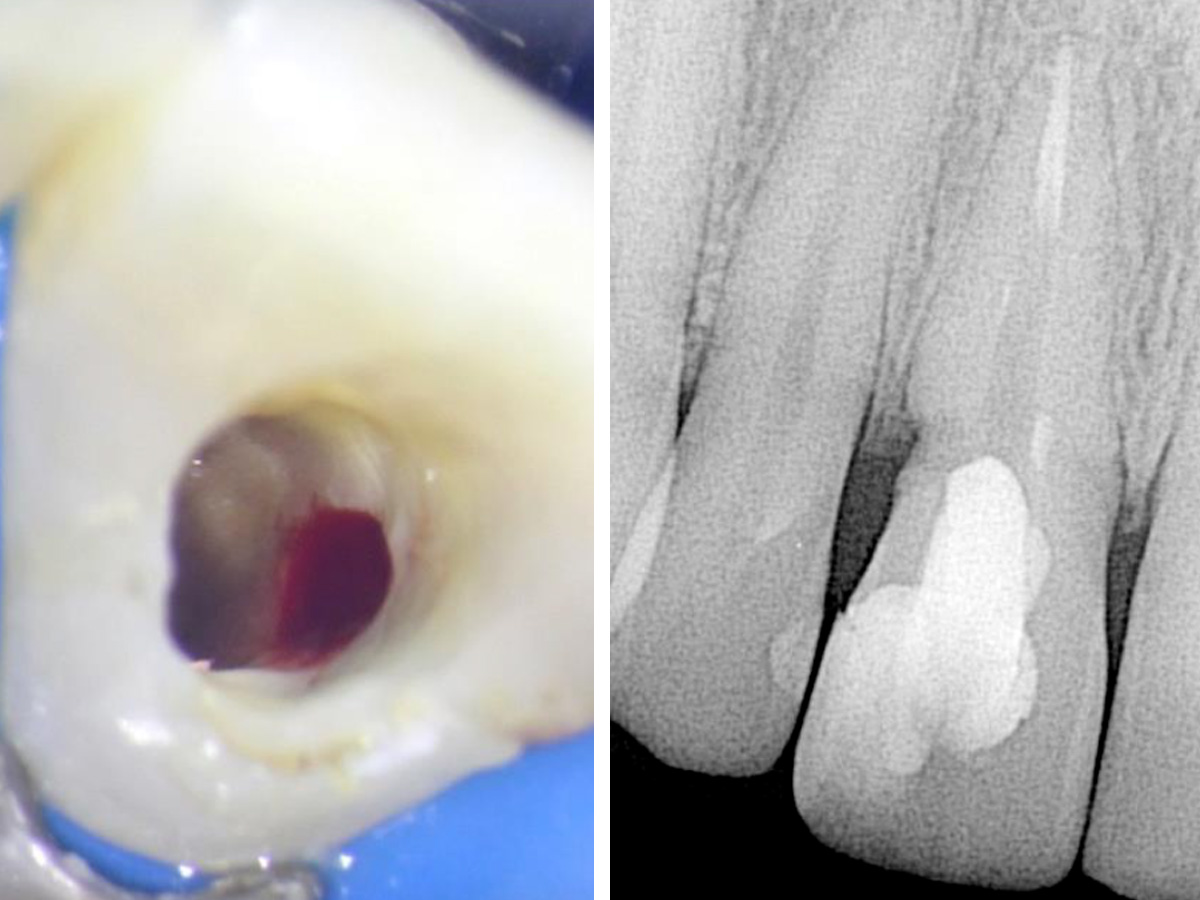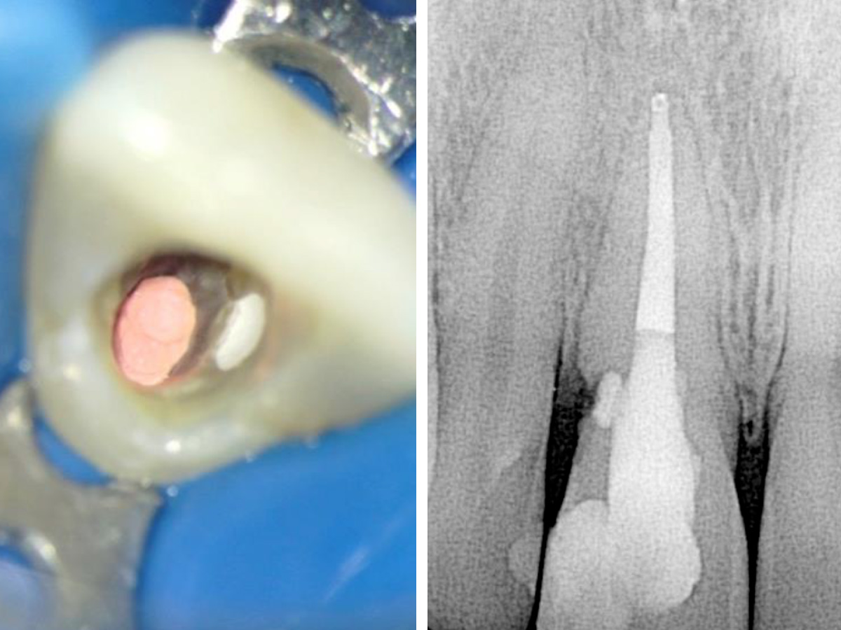 Der geöffnete Zugang zeigt die Gutta-Percha im koronalen Kanal und das BC Putty im resorptiven Defekt. Das Röntgenbild zeigt die Situation direkt nach der Behandlung.