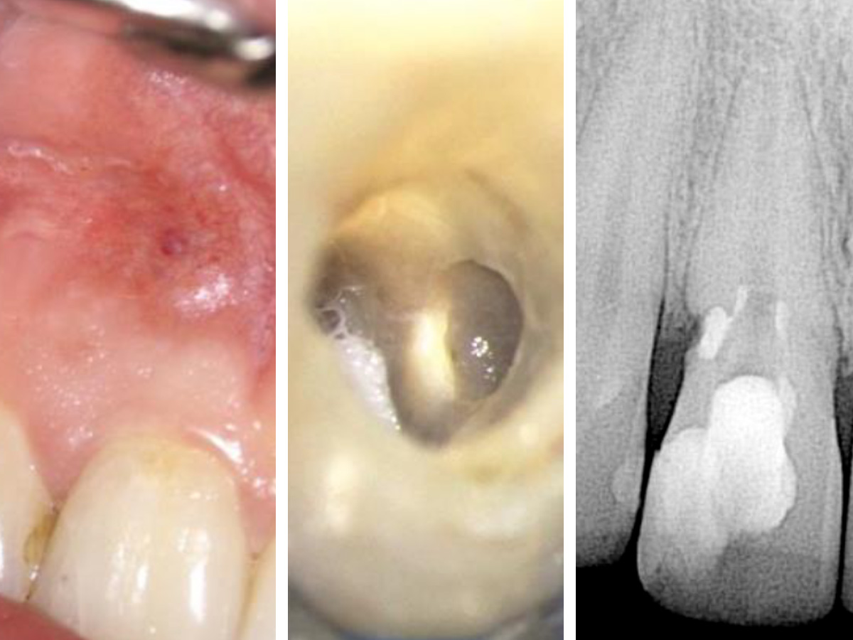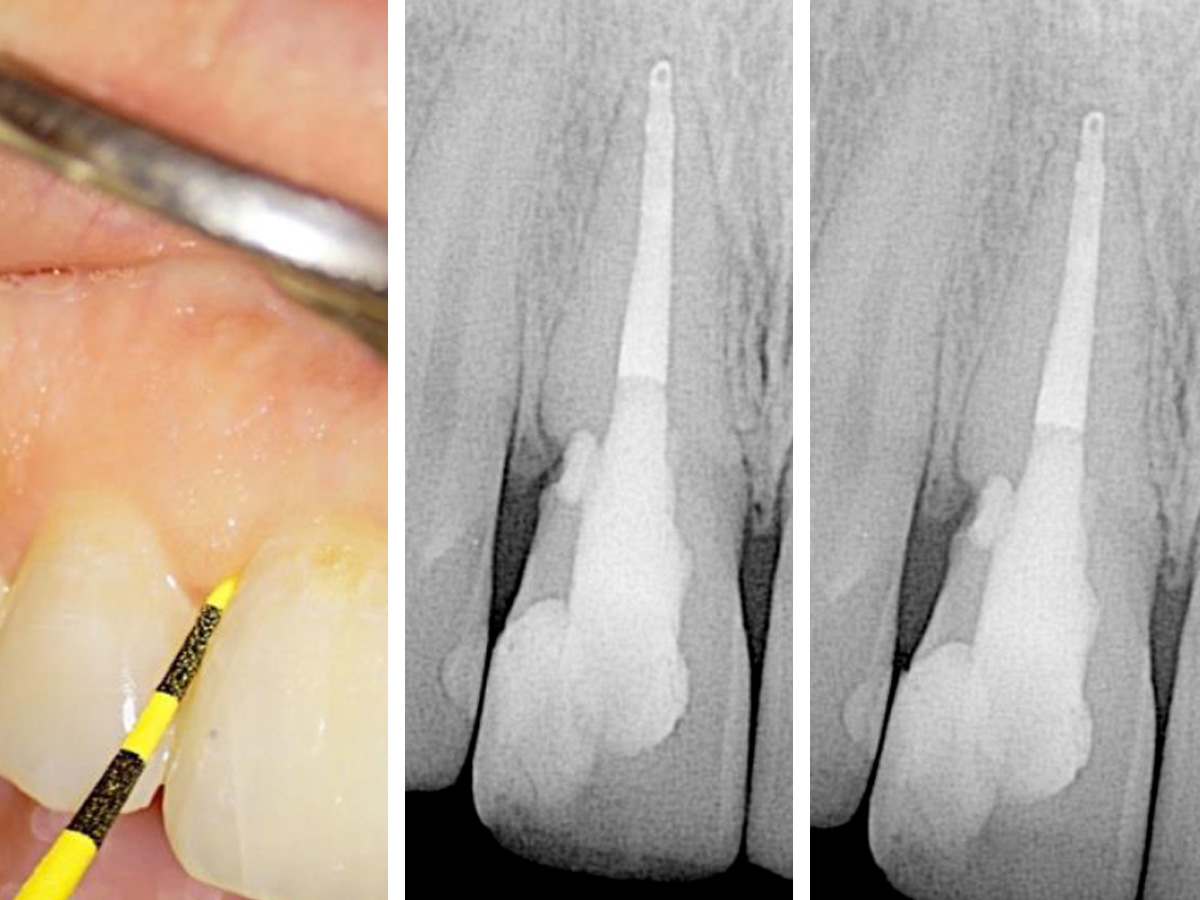 Eine 29-jährige kaukasische Frau stellte sich mit Beschwerden an Zahn 11 vor, der wackelte und am Zahnfleisch Eiter aufwies. Ihre medizinische Vorgeschichte war irrelevant. Ihre zahnmedizinische Vorgeschichte beinhaltete eine Wurzelbehandlung, die 11 Jahre zurücklag. Der Zahn hatte sich etwa vier Jahre zuvor verfärbt und wurde mit Wasserstoffperoxid gebleicht. Die klinische und röntgenografische Untersuchung zeigte eine Fistelöffnung, die zu einem resorptiven Defekt im zervikalen Bereich des Zahnes führte (Abb. 1).