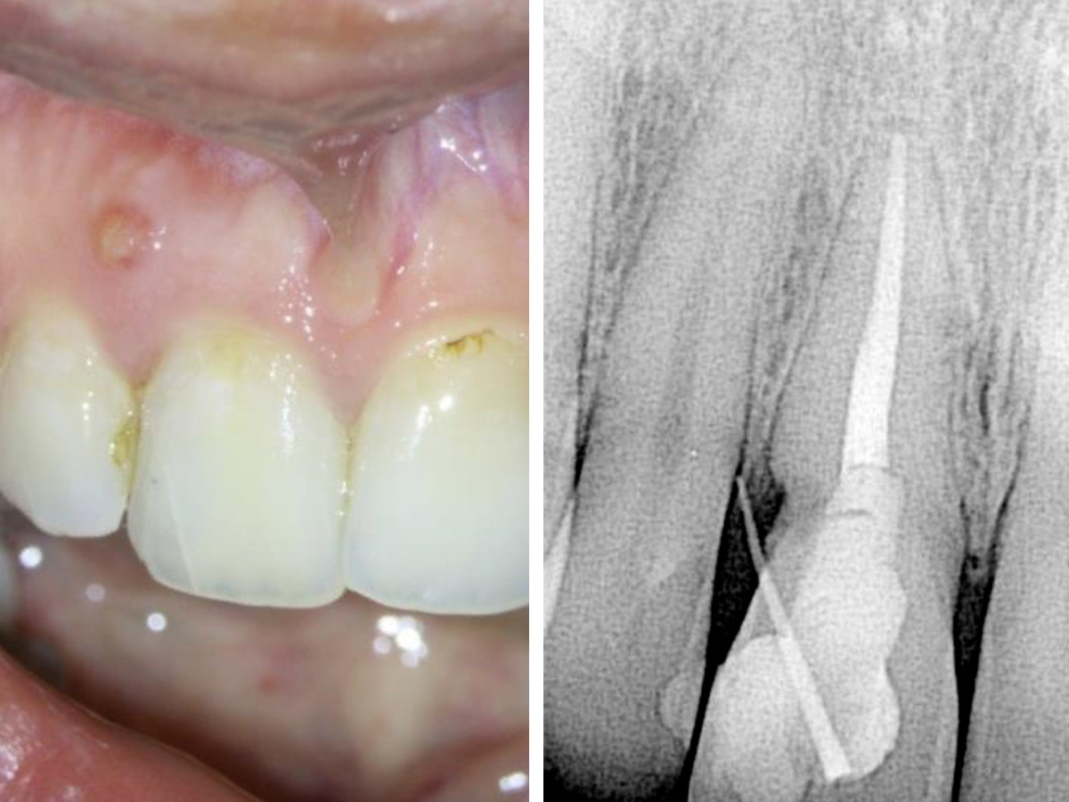 Klinische und röntgenografische Ansichten zeigen eine Fistelbildung, die bei genauerer Untersuchung zu einem distal liegenden, zervikalen Defekt an Zahn 11 führte.