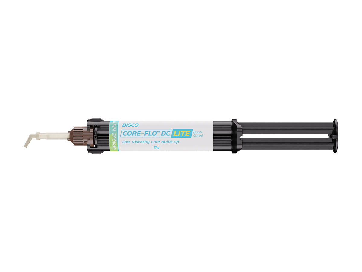 CORE-FLO DC Lite ist ein dualhärtendes, fluoridabgebendes Material, das sich ideal zum Stumpfaufbau, zur Stiftzementierung und als Dentin-Ersatzmaterial eignet. Seine geringe Viskosität ermöglicht ein optimales Handling und die hohe Radioopazität förderteine gute Diagnostik. Auf Dentin entwickelt CORE-FLO DC Lite eine sehr hohe Festigkeit. Das dualhärtende Stumpfaufbaumaterial ist in den Farben Natural/A und Opaque White erhältlich.