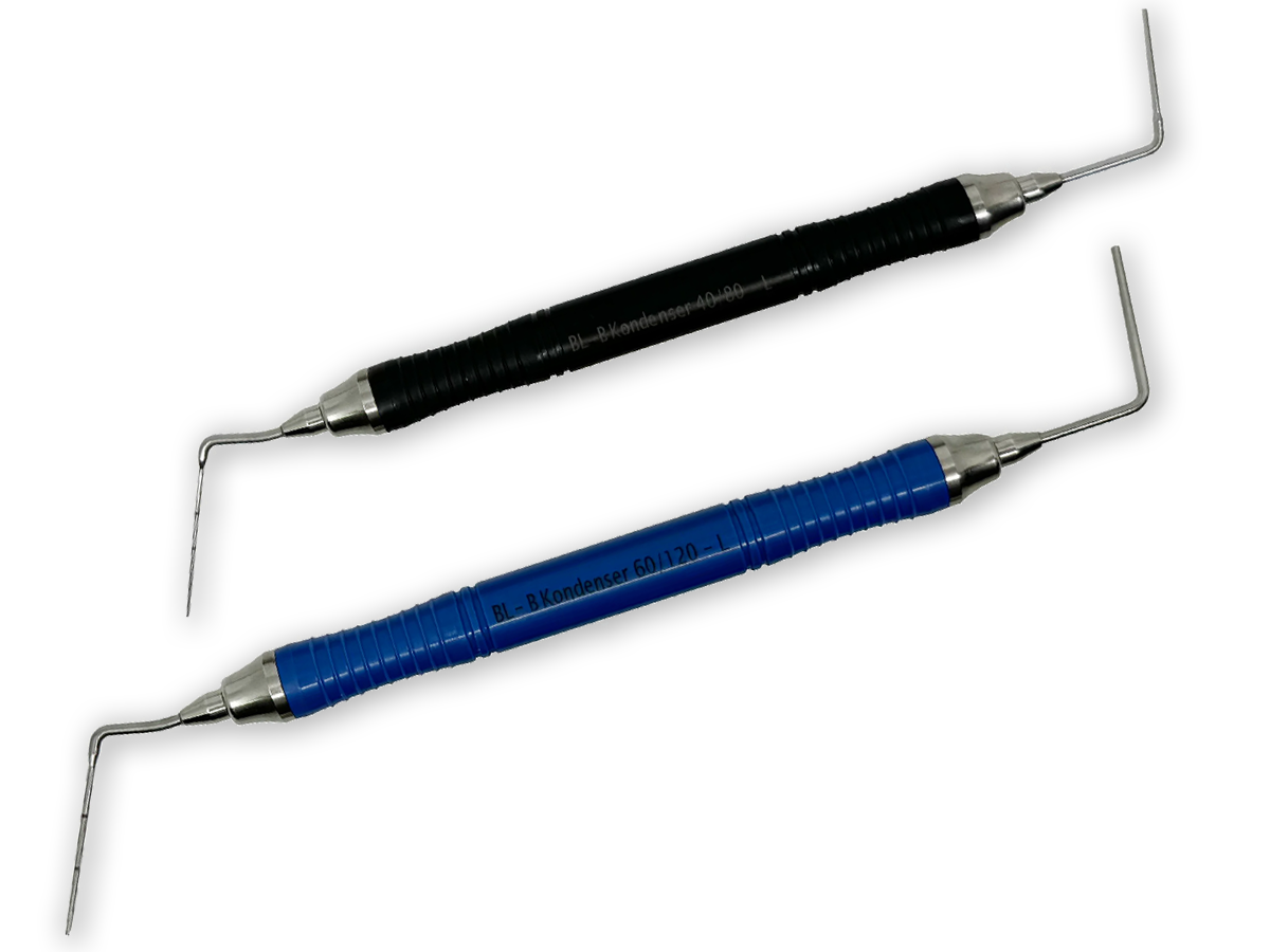 Die doppelendigen Instrumente sind auf der kleineren Seite aus hochwertigem Nickel-Titan gefertigt und auf der anderen Seite aus stabilem Stahl. Somit steht ein sehr flexibler Kondenser für den apikalen Bereich zur Verfügung. Die Handplugger sind in 21 mm und in einer verlängerten Version (Long) mit einer Länge von 25 mm (NiTi) erhältlich.
