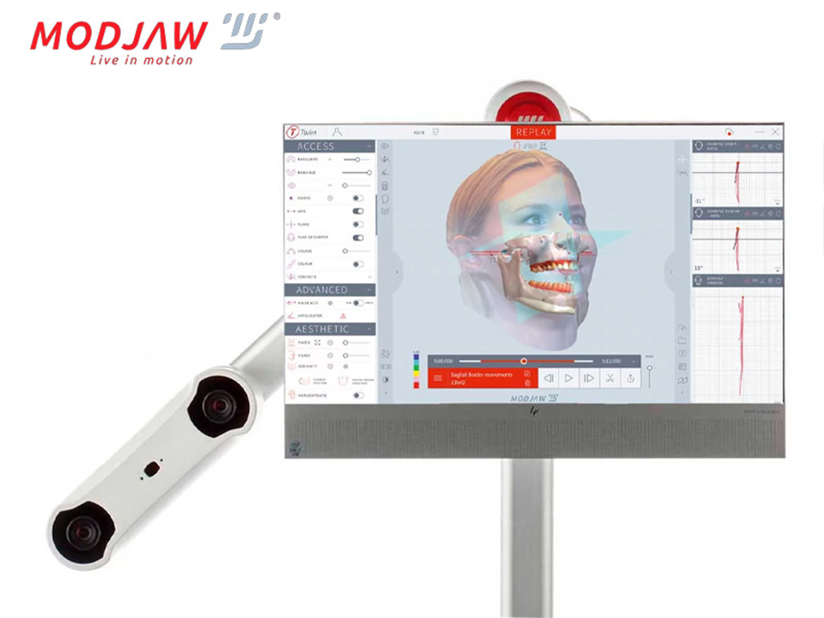 Der Funktionsscanner zeichnet die Bewegungen des Unterkiefers in Relation zum Oberkiefer präzise auf. Die Echtzeitdarstellung steigert die Compliance des Patienten und ermöglicht eine umfassende Diagnostik. Kombiniert mit einem Facescan und einem segmentierten DVT, bietet Modjaw® die Möglichkeit einer ganzheitlichen Analyse. Die aufgezeichneten Bewegungsdaten können nahtlos in alle gängigen Formate exportiert werden, beispielsweise in die CAD-Software des Technikers für digitale Artikulatoren oder SmileFy.
