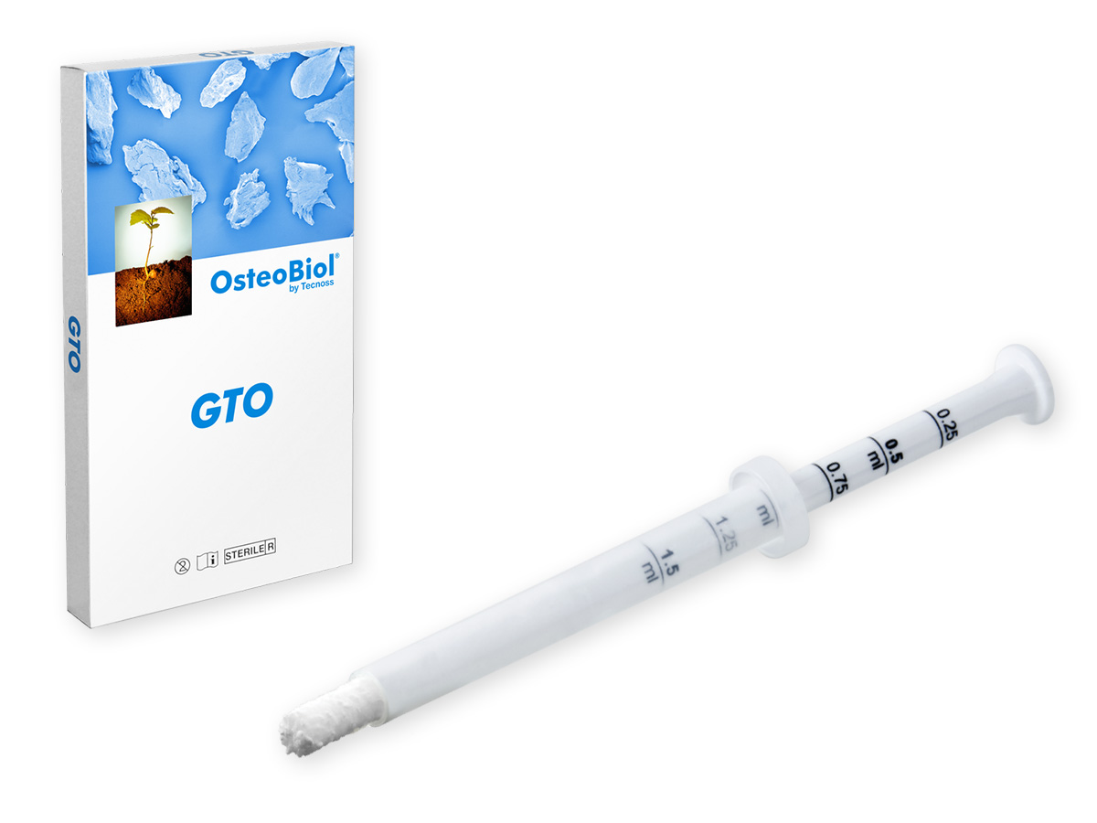 OsteoBiol® GTO® ist ein heterologes Knochenersatzmaterial. Das kollagenhaltige, kortikospongiöse Granulat mit 600-1.000 μm Korngröße ist im idealen Verhältnis mit OsteoBiol® TSV Gel kombiniert, das eine Mischung aus heterologem Kollagengel Typ I und III mit mehrfach ungesättigten Fettsäuren und einem biokompatiblen synthetischen Copolymer in wässriger Lösung darstellt.