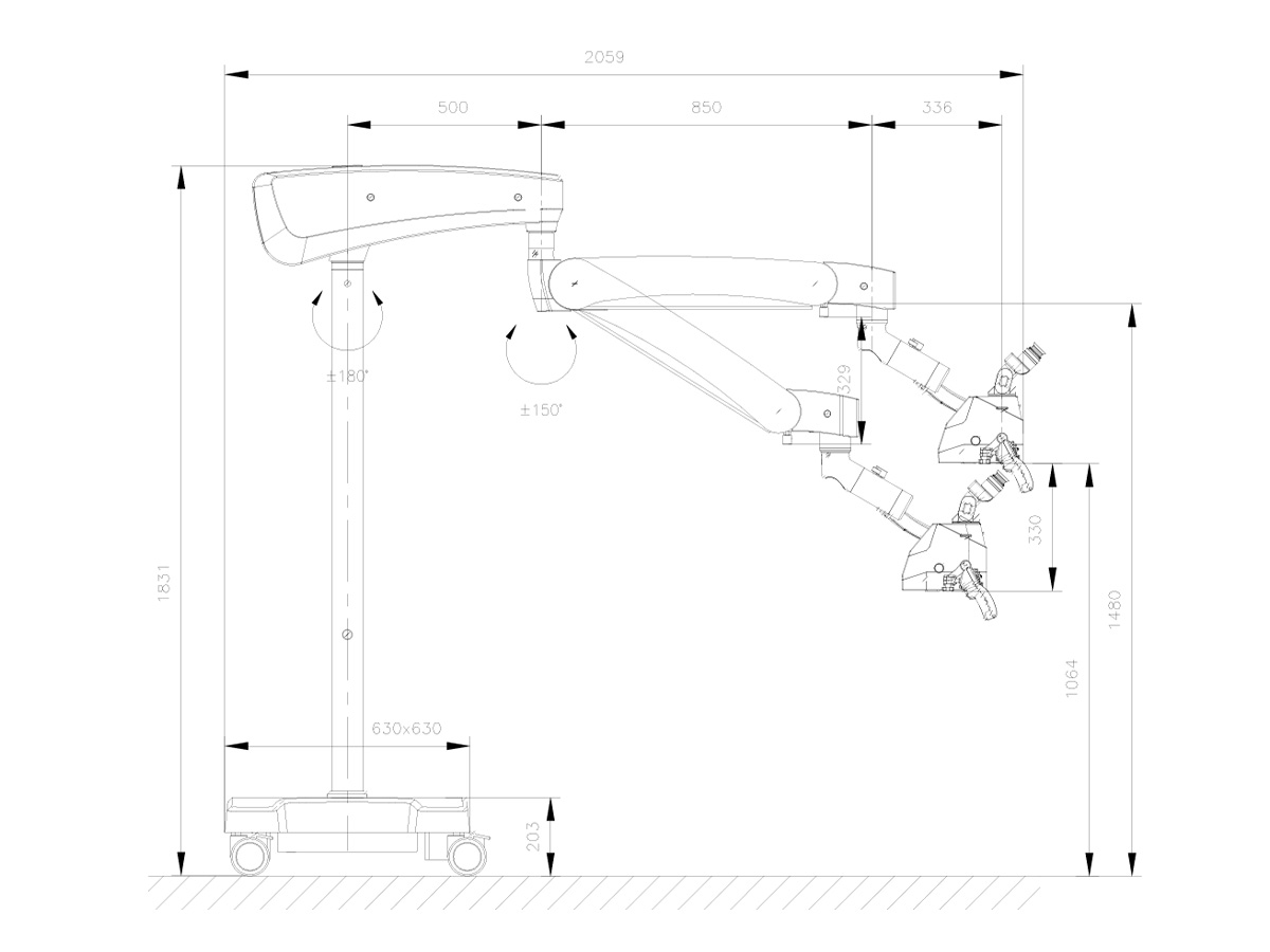 Das Mikroskop ElektroMag (OMS3200R2) passt sich auf Knopfdruck den Anforderungen des Behandlers an. Mittels der sechs Magnetbremse kann das Mikroskop präzise und ergonomisch positioniert und fixiert werden. Es ist mit hochwertiger LED-Technik (150.000 Lux bei 250 mm Arbeitsabstand), einem 180° Schwenktubus und einem Balanced Arm ausgestattet. Der motorische, stufenlose Zoom erlaubt dem Behandler eine bis zu 20,0-fache Vergrößerung. Über die Joysticks lässt sich so die gewünschte Vergrößerung komfortabeleinstellen – vom Überblick über den kompletten Zahnbogen bis hin zur höchstmöglichen Vergrößerung für präzise und detaillierte Untersuchungen. Das Dentalmikroskop ist zudem mit einem Gelbfilter ausgestattet, der das vorzeitige Aushärten von lichtsensitiven Materialien vermeidet, sowie einem Grünfilter, der die Detailsicht verbessert. Mit der integrierten VarioDist-Linse kann der Arbeitsabstand von 200 bis 450 mm über die Bedienelemente an den Handgriffen frei gewählt werden. Weitere Vorteile sind, dass dasMikroskop mit einer Hand bedient werden kann und die Kabel im Inneren verlaufen, was die Handhabung und Reinigung erleichtert. Das Mikroskop ElektroMag (OMS3200R2) ist mit Rollenstativ, Decken- oder Wandhalterung erhältlich.