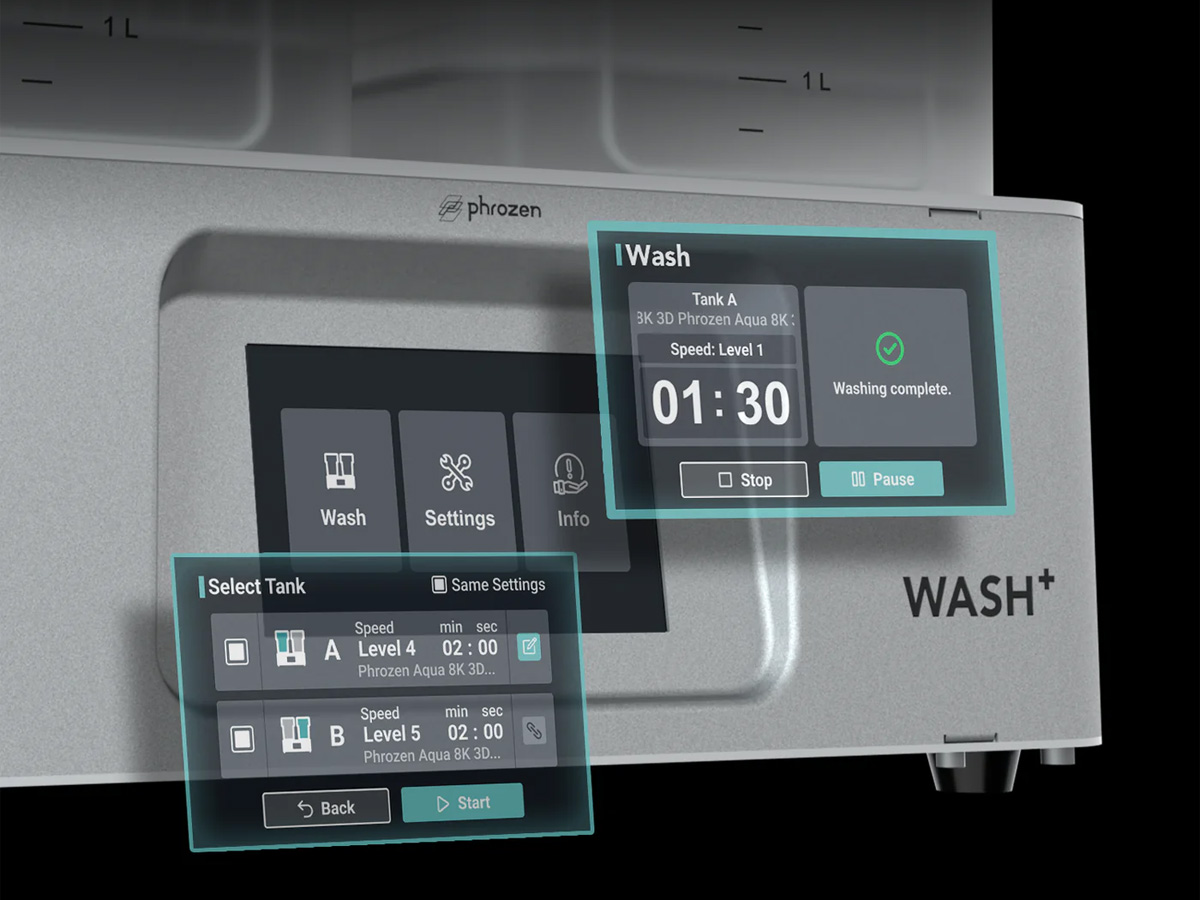 · Wash+ ist eine vielseitige Reinigungslösung, die auf Ihren dentalen 3D-Druck-Workflow zugeschnitten ist.