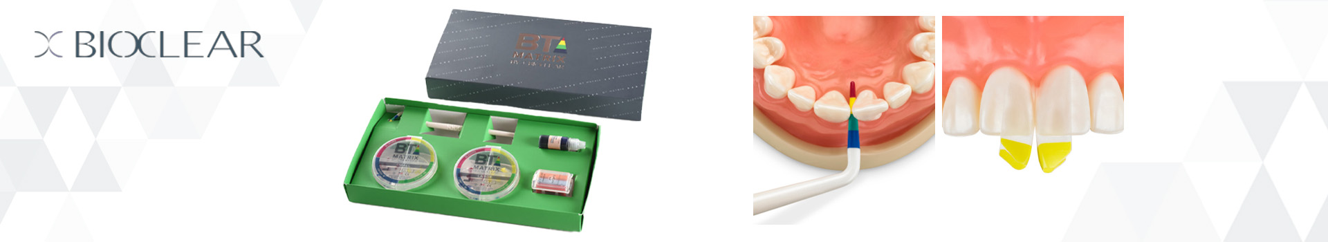 Die Bioclear Black Triangle Matrizen sind speziell für die Behandlung von sogenannten schwarzen Dreiecken konzipiert und müssen vor dem Einsetzen nicht zurechtgeschnitten werden. Die Matrizen sind in unterschiedlichen Größen und Krümmungen erhältlich.