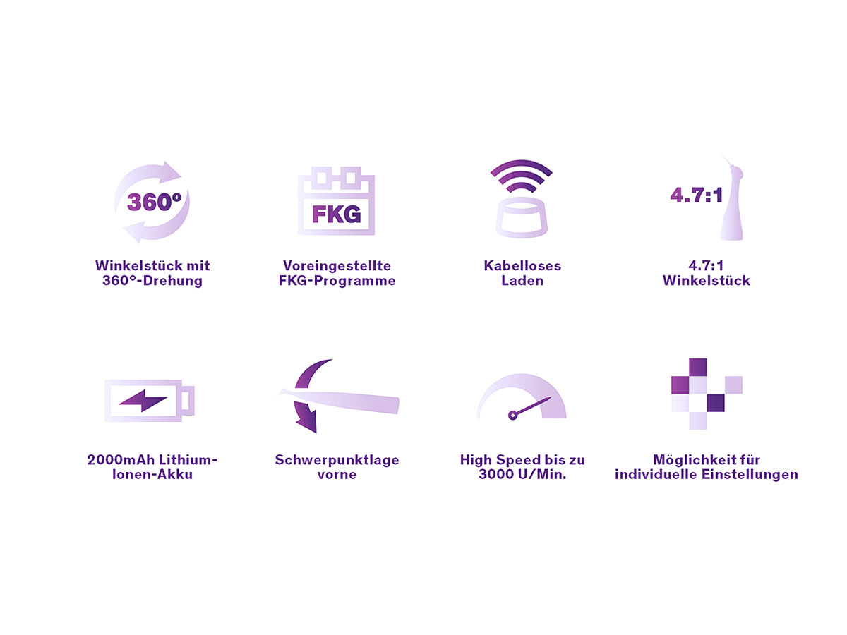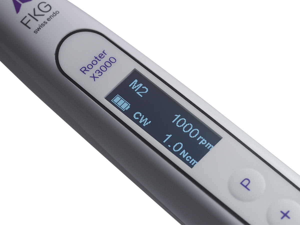 Eine Wurzelkanalaufbereitung mit bis zu 3.300 U/min ermöglicht der Rooter® X3000, ein kabelloser Endodontie-Motor mit integriertem Apex-Locator. Der Einsatz dieses hochflexiblen Geräts für reziprok und voll rotierende Feilen-systeme steigert die Arbeitseffizienz und spart kostbare Behandlungszeit. Der Endodontie-Motor verfügt über 3 Arbeitsmodi für eine maximale Benutzerfreundlichkeit: einen einzelnen Endo-Motor-Modus, einen Endo-Motor-Modus mit Apex-Lokalisierung und einen einzelnen Apex-Lokalisierungsmodus. Der Rooter® X3000 eignet sich hervorragend für die Revision und verfügt über voreingestellte Programme für die FKG-Instrumente der Reihe RACE® EVO, R-Motion® und XP-endo®. Drehzahlbereich: 100 - 3.300 rpm, Drehmoment 0,4 - 4 Ncm.