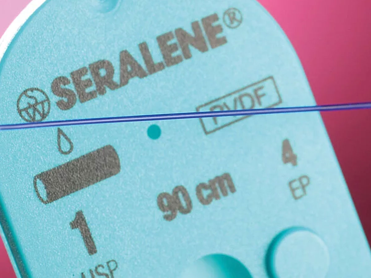 Das Seralene-Nahtmaterial wurde speziell für die Gefäßchirurgie entwickelt. Seralene ist ein monofiler, nicht resorbierbarer Faden aus PVDF (Polyvinylidenfluorid), dessen glatte und porenfreie Oberfläche für ein optimales Gleitverhalten im Gewebe sorgt.